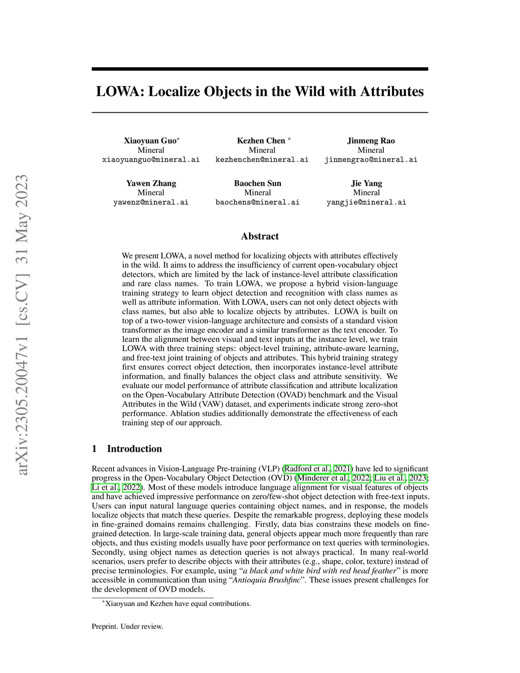 We present LOWA, a novel method for localizing objects with attributes effectively in the wild. It aims to address the insufficiency of current open-vocabulary object detectors, which are limited by the lack of instance-level attribute classification and rare class names. To train LOWA, we propose a hybrid vision-language training strategy to learn object detection and recognition with class names as well as attribute information. With LOWA, users can not only detect objects with class names, but also able to localize objects by attributes. LOWA is built on top of a two-tower vision-language architecture and consists of a standard vision transformer as the image encoder and a similar transformer as the text encoder. To learn the alignment between visual and text inputs at the instance level, we train LOWA with three training steps: object-level training, attribute-aware learning, and free-text joint training of objects and attributes. This hybrid training strategy first ensures correct object detection, then incorporates instance-level attribute information, and finally balances the object class and attribute sensitivity. We evaluate our model performance of attribute classification and attribute localization on the Open-Vocabulary Attribute Detection (OVAD) benchmark and the Visual Attributes in the Wild (VAW) dataset, and experiments indicate strong zero-shot performance. Ablation studies additionally demonstrate the effectiveness of each training step of our approach.
