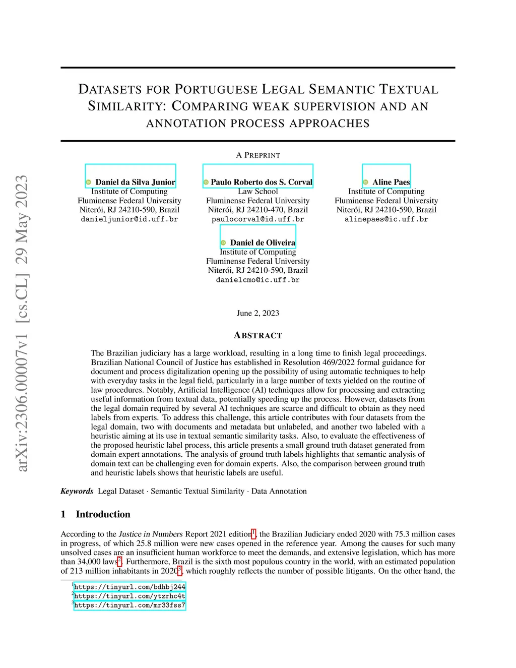 The Brazilian judiciary has a large workload, resulting in a long time to finish legal proceedings. Brazilian National Council of Justice has established in Resolution 469/2022 formal guidance for document and process digitalization opening up the possibility of using automatic techniques to help with everyday tasks in the legal field, particularly in a large number of texts yielded on the routine of law procedures. Notably, Artificial Intelligence (AI) techniques allow for processing and extracting useful information from textual data, potentially speeding up the process. However, datasets from the legal domain required by several AI techniques are scarce and difficult to obtain as they need labels from experts. To address this challenge, this article contributes with four datasets from the legal domain, two with documents and metadata but unlabeled, and another two labeled with a heuristic aiming at its use in textual semantic similarity tasks. Also, to evaluate the effectiveness of the proposed heuristic label process, this article presents a small ground truth dataset generated from domain expert annotations. The analysis of ground truth labels highlights that semantic analysis of domain text can be challenging even for domain experts. Also, the comparison between ground truth and heuristic labels shows that heuristic labels are useful.