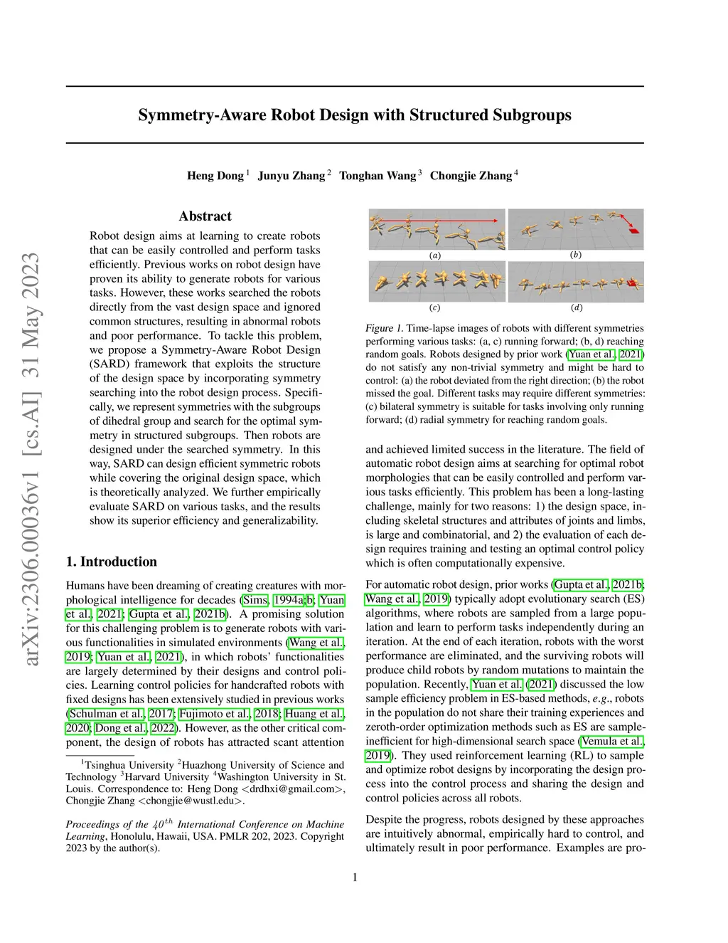 Robot design aims at learning to create robots that can be easily controlled and perform tasks efficiently. Previous works on robot design have proven its ability to generate robots for various tasks. However, these works searched the robots directly from the vast design space and ignored common structures, resulting in abnormal robots and poor performance. To tackle this problem, we propose a Symmetry-Aware Robot Design (SARD) framework that exploits the structure of the design space by incorporating symmetry searching into the robot design process. Specifically, we represent symmetries with the subgroups of the dihedral group and search for the optimal symmetry in structured subgroups. Then robots are designed under the searched symmetry. In this way, SARD can design efficient symmetric robots while covering the original design space, which is theoretically analyzed. We further empirically evaluate SARD on various tasks, and the results show its superior efficiency and generalizability.