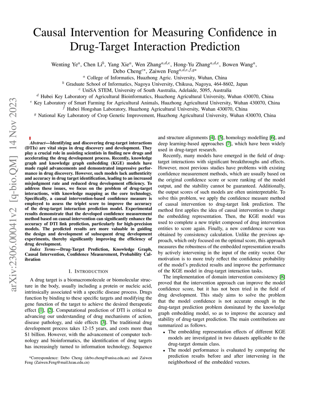 The identification and discovery of drug-target Interaction (DTI) is an important step in the field of Drug research and development, which can help scientists discover new drugs and accelerate the development process. KnowledgeGraph and the related knowledge graph Embedding (KGE) model develop rapidly and show good performance in the field of drug discovery in recent years. In the task of drug target identification, the lack of authenticity and accuracy of the model will lead to the increase of misjudgment rate and the low efficiency of drug development. To solve the above problems, this study focused on the problem of drug target link prediction with knowledge mapping as the core technology, and adopted the confidence measurement method based on causal intervention to measure the triplet score, so as to improve the accuracy of drug target interaction prediction model. By comparing with the traditional Softmax and Sigmod confidence measurement methods on different KGE models, the results show that the confidence measurement method based on causal intervention can effectively improve the accuracy of DTI link prediction, especially for high-precision models. The predicted results are more conducive to guiding the design and development of followup experiments of drug development, so as to improve the efficiency of drug development.