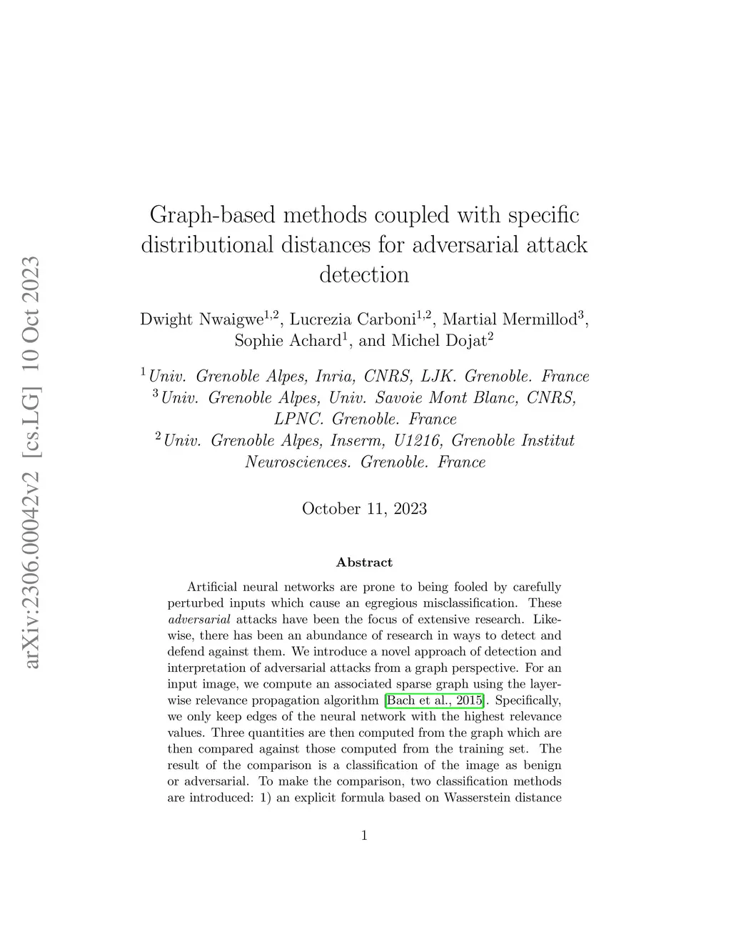 Artificial neural networks are prone to being fooled by carefully perturbed inputs which cause an egregious misclassification. These \textit{adversarial} attacks have been the focus of extensive research. Likewise, there has been an abundance of research in ways to detect and defend against them. We introduce a novel approach of detection and interpretation of adversarial attacks from a graph perspective. For an input image, we compute an associated sparse graph using the layer-wise relevance propagation algorithm \cite{bach15}. Specifically, we only keep edges of the neural network with the highest relevance values. Three quantities are then computed from the graph which are then compared against those computed from the training set. The result of the comparison is a classification of the image as benign or adversarial. To make the comparison, two classification methods are introduced: 1) an explicit formula based on Wasserstein distance applied to the degree of node and 2) a logistic regression. Both classification methods produce strong results which lead us to believe that a graph-based interpretation of adversarial attacks is valuable.