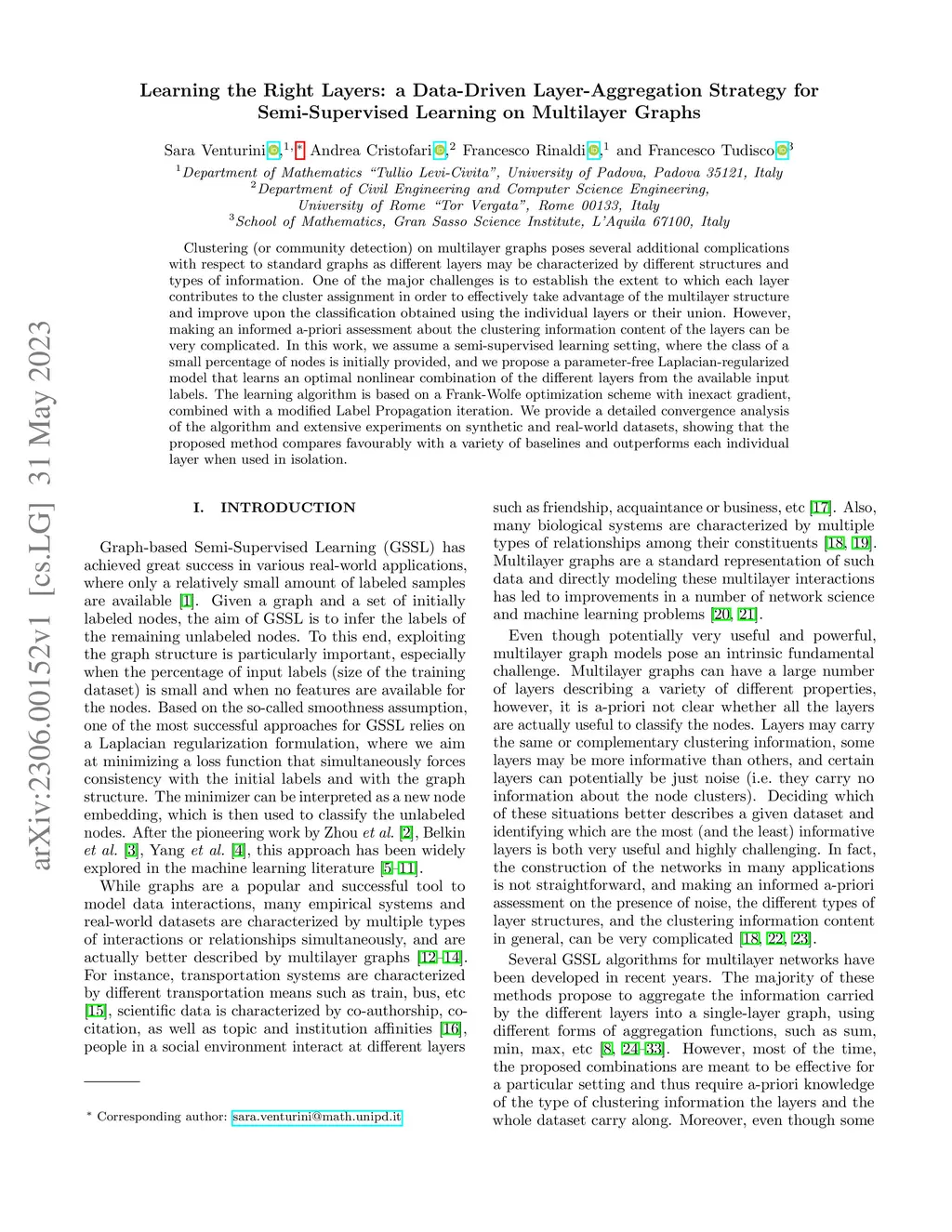 Clustering (or community detection) on multilayer graphs poses several additional complications with respect to standard graphs as different layers may be characterized by different structures and types of information. One of the major challenges is to establish the extent to which each layer contributes to the cluster assignment in order to effectively take advantage of the multilayer structure and improve upon the classification obtained using the individual layers or their union. However, making an informed a-priori assessment about the clustering information content of the layers can be very complicated. In this work, we assume a semi-supervised learning setting, where the class of a small percentage of nodes is initially provided, and we propose a parameter-free Laplacian-regularized model that learns an optimal nonlinear combination of the different layers from the available input labels. The learning algorithm is based on a Frank-Wolfe optimization scheme with inexact gradient, combined with a modified Label Propagation iteration. We provide a detailed convergence analysis of the algorithm and extensive experiments on synthetic and real-world datasets, showing that the proposed method compares favourably with a variety of baselines and outperforms each individual layer when used in isolation.