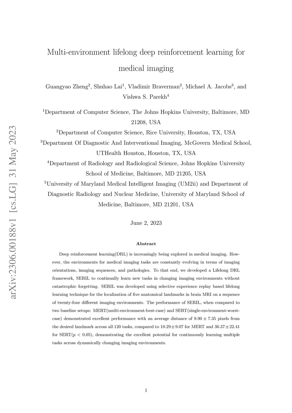 Deep reinforcement learning(DRL) is increasingly being explored in medical imaging. However, the environments for medical imaging tasks are constantly evolving in terms of imaging orientations, imaging sequences, and pathologies. To that end, we developed a Lifelong DRL framework, SERIL to continually learn new tasks in changing imaging environments without catastrophic forgetting. SERIL was developed using selective experience replay based lifelong learning technique for the localization of five anatomical landmarks in brain MRI on a sequence of twenty-four different imaging environments. The performance of SERIL, when compared to two baseline setups: MERT(multi-environment-best-case) and SERT(single-environment-worst-case) demonstrated excellent performance with an average distance of pixels from the desired landmark across all 120 tasks, compared to for MERT and for SERT(), demonstrating the excellent potential for continuously learning multiple tasks across dynamically changing imaging environments.