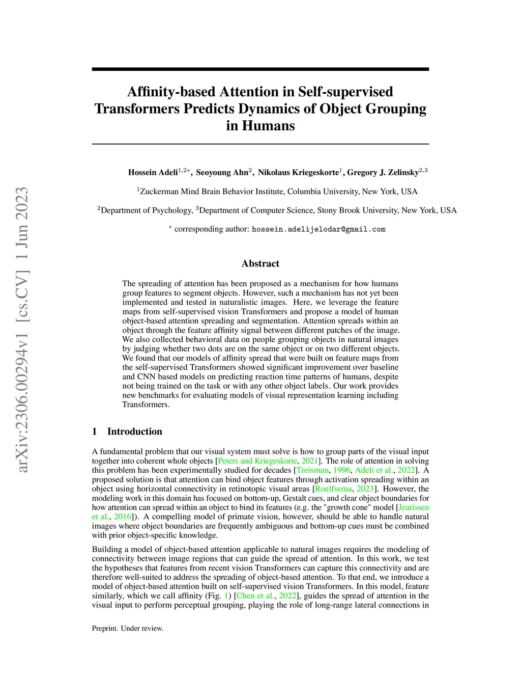 The spreading of attention has been proposed as a mechanism for how humans group features to segment objects. However, such a mechanism has not yet been implemented and tested in naturalistic images. Here, we leverage the feature maps from self-supervised vision Transformers and propose a model of human object-based attention spreading and segmentation. Attention spreads within an object through the feature affinity signal between different patches of the image. We also collected behavioral data on people grouping objects in natural images by judging whether two dots are on the same object or on two different objects. We found that our models of affinity spread that were built on feature maps from the self-supervised Transformers showed significant improvement over baseline and CNN based models on predicting reaction time patterns of humans, despite not being trained on the task or with any other object labels. Our work provides new benchmarks for evaluating models of visual representation learning including Transformers.