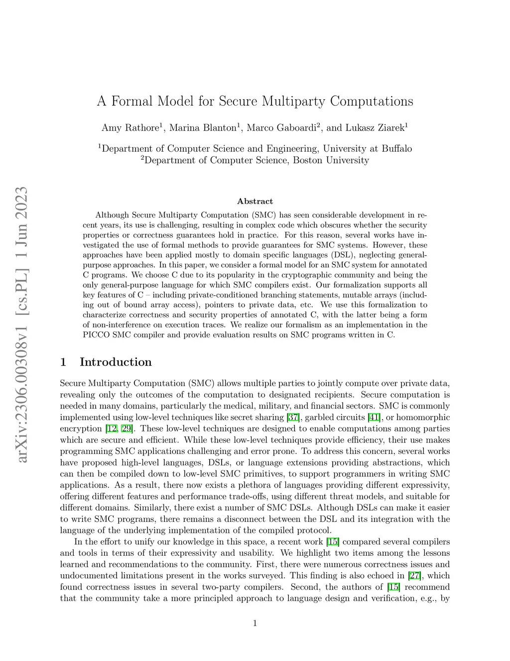 Although Secure Multiparty Computation (SMC) has seen considerable development in recent years, its use is challenging, resulting in complex code which obscures whether the security properties or correctness guarantees hold in practice. For this reason, several works have investigated the use of formal methods to provide guarantees for SMC systems. However, these approaches have been applied mostly to domain specific languages (DSL), neglecting general-purpose approaches. In this paper, we consider a formal model for an SMC system for annotated C programs. We choose C due to its popularity in the cryptographic community and being the only general-purpose language for which SMC compilers exist. Our formalization supports all key features of C -- including private-conditioned branching statements, mutable arrays (including out of bound array access), pointers to private data, etc. We use this formalization to characterize correctness and security properties of annotated C, with the latter being a form of non-interference on execution traces. We realize our formalism as an implementation in the PICCO SMC compiler and provide evaluation results on SMC programs written in C.