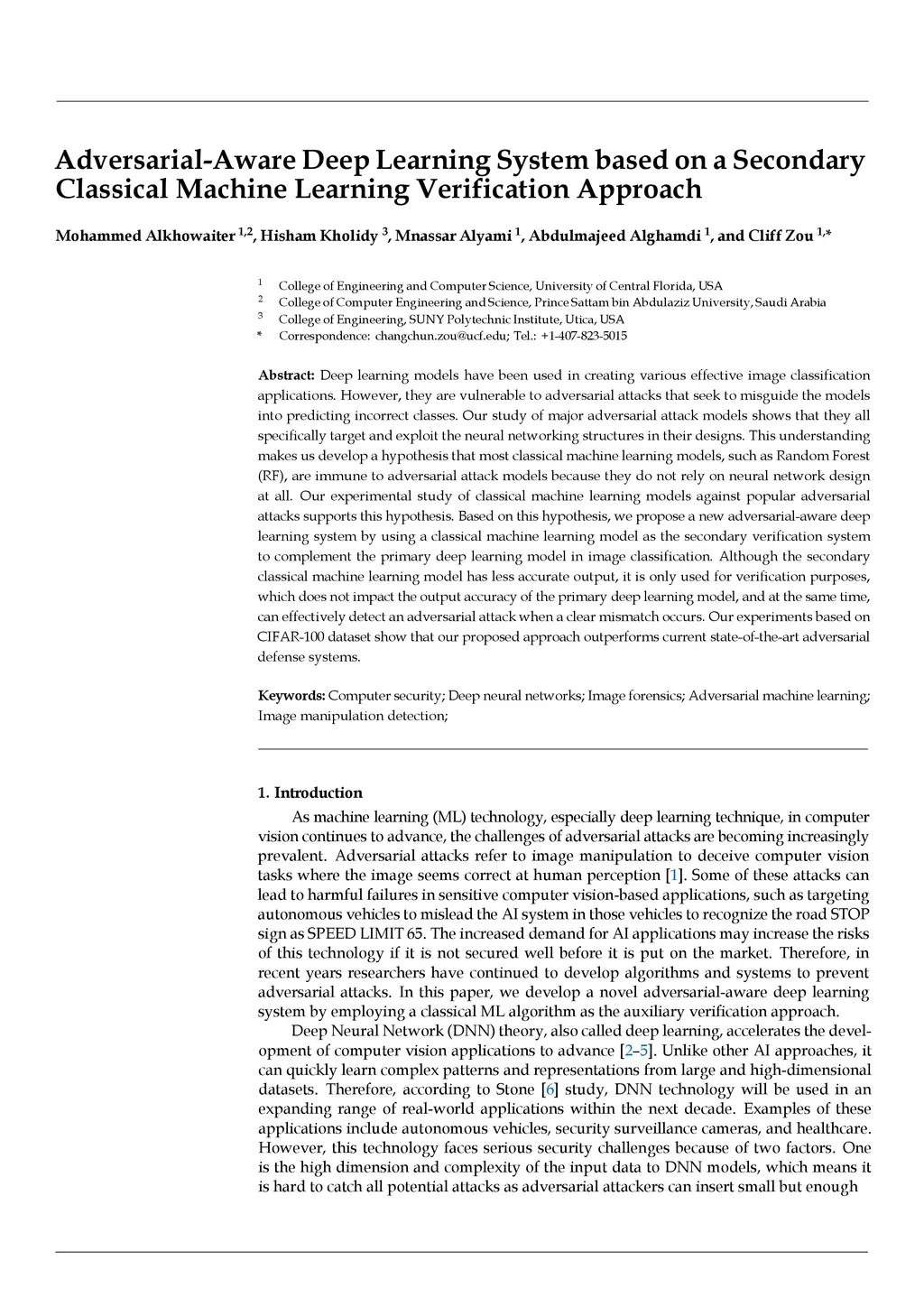 Deep learning models have been used in creating various effective image classification applications. However, they are vulnerable to adversarial attacks that seek to misguide the models into predicting incorrect classes. Our study of major adversarial attack models shows that they all specifically target and exploit the neural networking structures in their designs. This understanding makes us develop a hypothesis that most classical machine learning models, such as Random Forest (RF), are immune to adversarial attack models because they do not rely on neural network design at all. Our experimental study of classical machine learning models against popular adversarial attacks supports this hypothesis. Based on this hypothesis, we propose a new adversarial-aware deep learning system by using a classical machine learning model as the secondary verification system to complement the primary deep learning model in image classification. Although the secondary classical machine learning model has less accurate output, it is only used for verification purposes, which does not impact the output accuracy of the primary deep learning model, and at the same time, can effectively detect an adversarial attack when a clear mismatch occurs. Our experiments based on CIFAR-100 dataset show that our proposed approach outperforms current state-of-the-art adversarial defense systems.