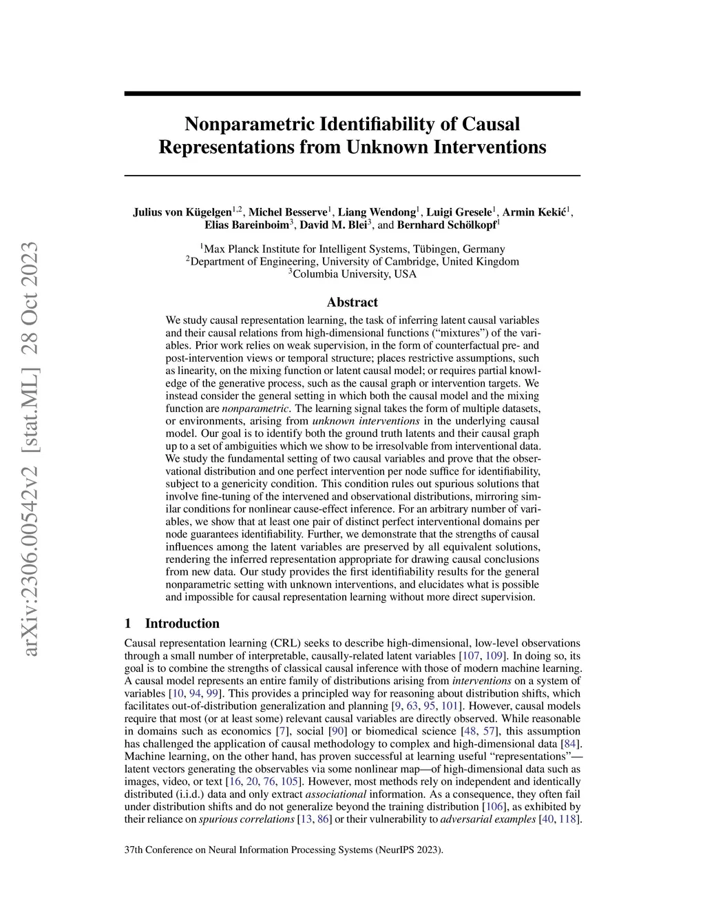 We study causal representation learning, the task of inferring latent causal variables and their causal relations from high-dimensional mixtures of the variables. Prior work relies on weak supervision, in the form of counterfactual pre- and post-intervention views or temporal structure; places restrictive assumptions, such as linearity, on the mixing function or latent causal model; or requires partial knowledge of the generative process, such as the causal graph or intervention targets. We instead consider the general setting in which both the causal model and the mixing function are nonparametric. The learning signal takes the form of multiple datasets, or environments, arising from unknown interventions in the underlying causal model. Our goal is to identify both the ground truth latents and their causal graph up to a set of ambiguities which we show to be irresolvable from interventional data. We study the fundamental setting of two causal variables and prove that the observational distribution and one perfect intervention per node suffice for identifiability, subject to a genericity condition. This condition rules out spurious solutions that involve fine-tuning of the intervened and observational distributions, mirroring similar conditions for nonlinear cause-effect inference. For an arbitrary number of variables, we show that at least one pair of distinct perfect interventional domains per node guarantees identifiability. Further, we demonstrate that the strengths of causal influences among the latent variables are preserved by all equivalent solutions, rendering the inferred representation appropriate for drawing causal conclusions from new data. Our study provides the first identifiability results for the general nonparametric setting with unknown interventions, and elucidates what is possible and impossible for causal representation learning without more direct supervision.