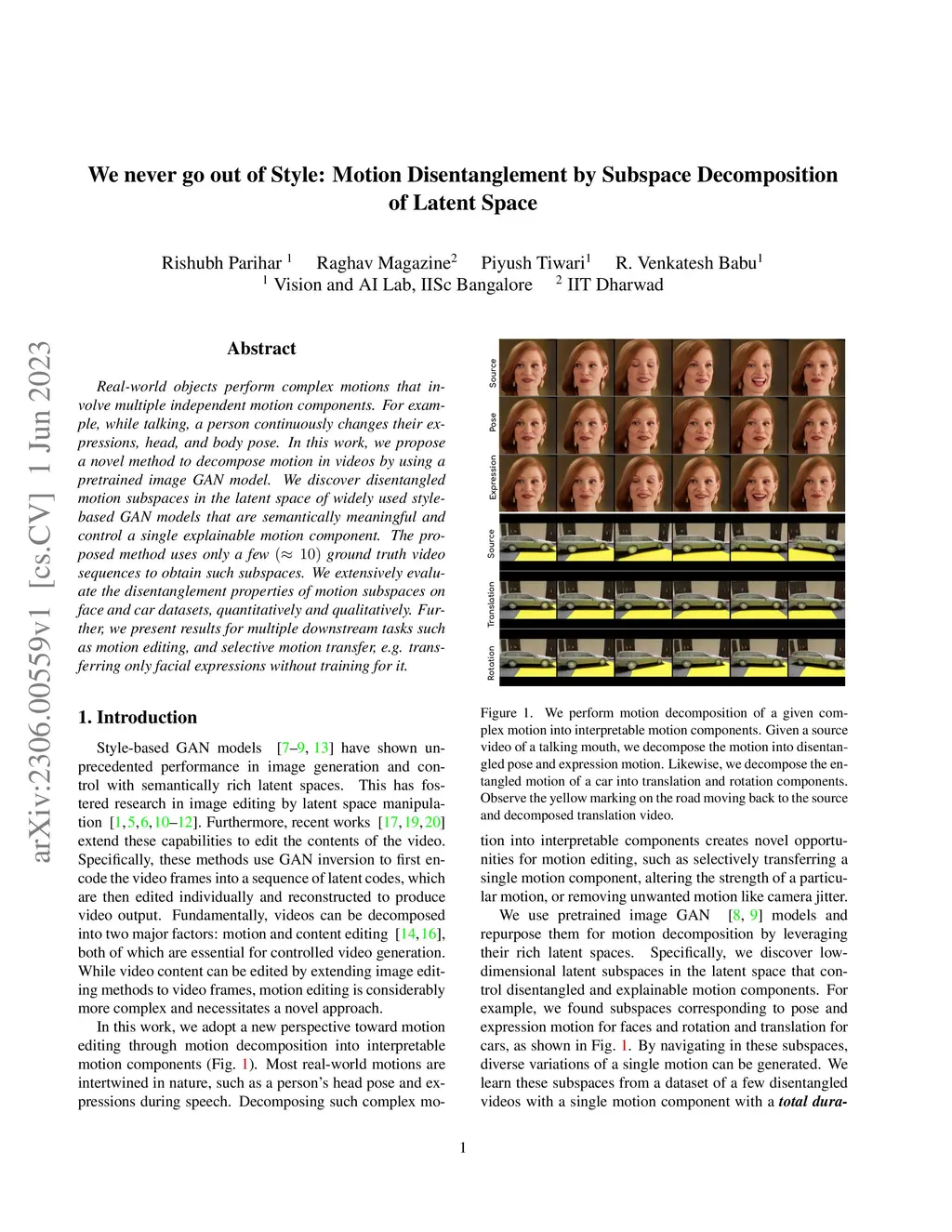 Real-world objects perform complex motions that involve multiple independent motion components. For example, while talking, a person continuously changes their expressions, head, and body pose. In this work, we propose a novel method to decompose motion in videos by using a pretrained image GAN model. We discover disentangled motion subspaces in the latent space of widely used style-based GAN models that are semantically meaningful and control a single explainable motion component. The proposed method uses only a few ground truth video sequences to obtain such subspaces. We extensively evaluate the disentanglement properties of motion subspaces on face and car datasets, quantitatively and qualitatively. Further, we present results for multiple downstream tasks such as motion editing, and selective motion transfer, e.g. transferring only facial expressions without training for it.