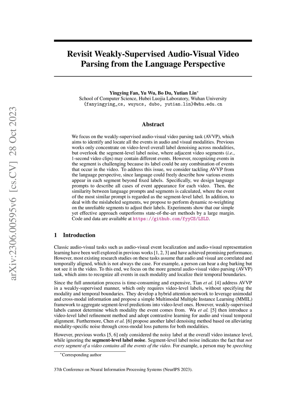 We focus on the weakly-supervised audio-visual video parsing task (AVVP), which aims to identify and locate all the events in audio/visual modalities. Previous works only concentrate on video-level overall label denoising across modalities, but overlook the segment-level label noise, where adjacent video segments (i.e., 1-second video clips) may contain different events. However, recognizing events in the segment is challenging because its label could be any combination of events that occur in the video. To address this issue, we consider tackling AVVP from the language perspective, since language could freely describe how various events appear in each segment beyond fixed labels. Specifically, we design language prompts to describe all cases of event appearance for each video. Then, the similarity between language prompts and segments is calculated, where the event of the most similar prompt is regarded as the segment-level label. In addition, to deal with the mislabeled segments, we propose to perform dynamic re-weighting on the unreliable segments to adjust their labels. Experiments show that our simple yet effective approach outperforms state-of-the-art methods by a large margin.
