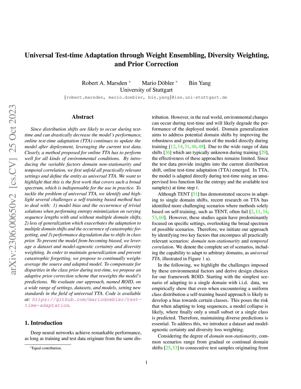 Universal Test-time Adaptation through Weight Ensembling, Diversity