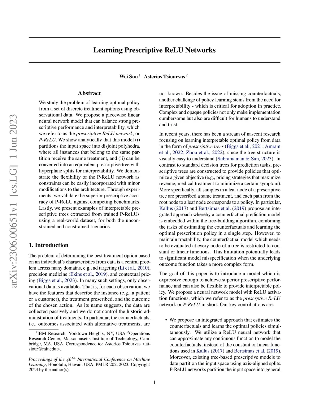 We study the problem of learning optimal policy from a set of discrete treatment options using observational data. We propose a piecewise linear neural network model that can balance strong prescriptive performance and interpretability, which we refer to as the prescriptive ReLU network, or P-ReLU. We show analytically that this model (i) partitions the input space into disjoint polyhedra, where all instances that belong to the same partition receive the same treatment, and (ii) can be converted into an equivalent prescriptive tree with hyperplane splits for interpretability. We demonstrate the flexibility of the P-ReLU network as constraints can be easily incorporated with minor modifications to the architecture. Through experiments, we validate the superior prescriptive accuracy of P-ReLU against competing benchmarks. Lastly, we present examples of interpretable prescriptive trees extracted from trained P-ReLUs using a real-world dataset, for both the unconstrained and constrained scenarios.