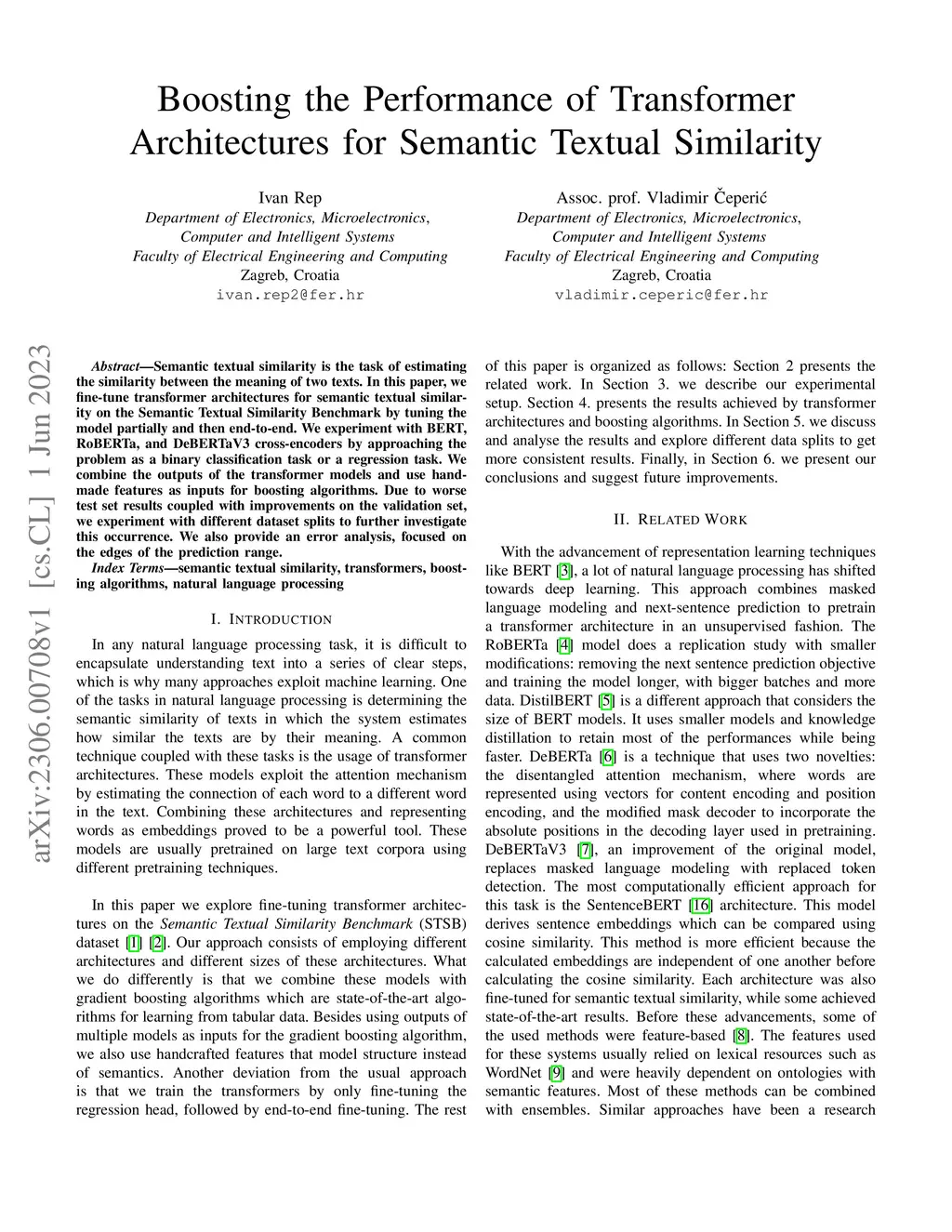 Semantic textual similarity is the task of estimating the similarity between the meaning of two texts. In this paper, we fine-tune transformer architectures for semantic textual similarity on the Semantic Textual Similarity Benchmark by tuning the model partially and then end-to-end. We experiment with BERT, RoBERTa, and DeBERTaV3 cross-encoders by approaching the problem as a binary classification task or a regression task. We combine the outputs of the transformer models and use handmade features as inputs for boosting algorithms. Due to worse test set results coupled with improvements on the validation set, we experiment with different dataset splits to further investigate this occurrence. We also provide an error analysis, focused on the edges of the prediction range.