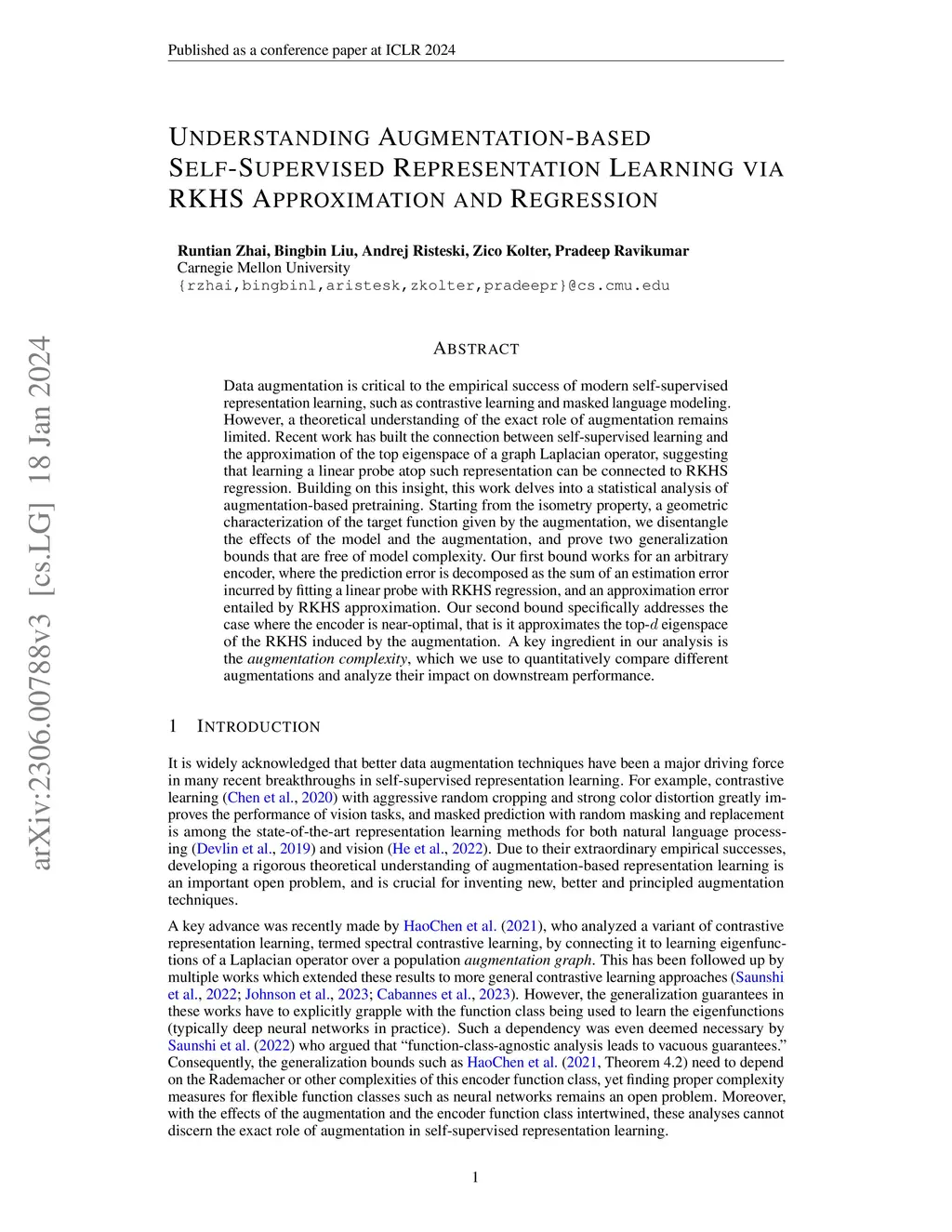 Data augmentation is critical to the empirical success of modern self-supervised representation learning, such as contrastive learning and masked language modeling. However, a theoretical understanding of the exact role of augmentation remains limited. Recent work has built the connection between self-supervised learning and the approximation of the top eigenspace of a graph Laplacian operator, suggesting that learning a linear probe atop such representation can be connected to RKHS regression. Building on this insight, this work delves into a statistical analysis of augmentation-based pretraining. Starting from the isometry property, a geometric characterization of the target function given by the augmentation, we disentangle the effects of the model and the augmentation, and prove two generalization bounds that are free of model complexity. Our first bound works for an arbitrary encoder, where the prediction error is decomposed as the sum of an estimation error incurred by fitting a linear probe with RKHS regression, and an approximation error entailed by RKHS approximation. Our second bound specifically addresses the case where the encoder is near-optimal, that is it approximates the top-d eigenspace of the RKHS induced by the augmentation. A key ingredient in our analysis is the augmentation complexity, which we use to quantitatively compare different augmentations and analyze their impact on downstream performance.