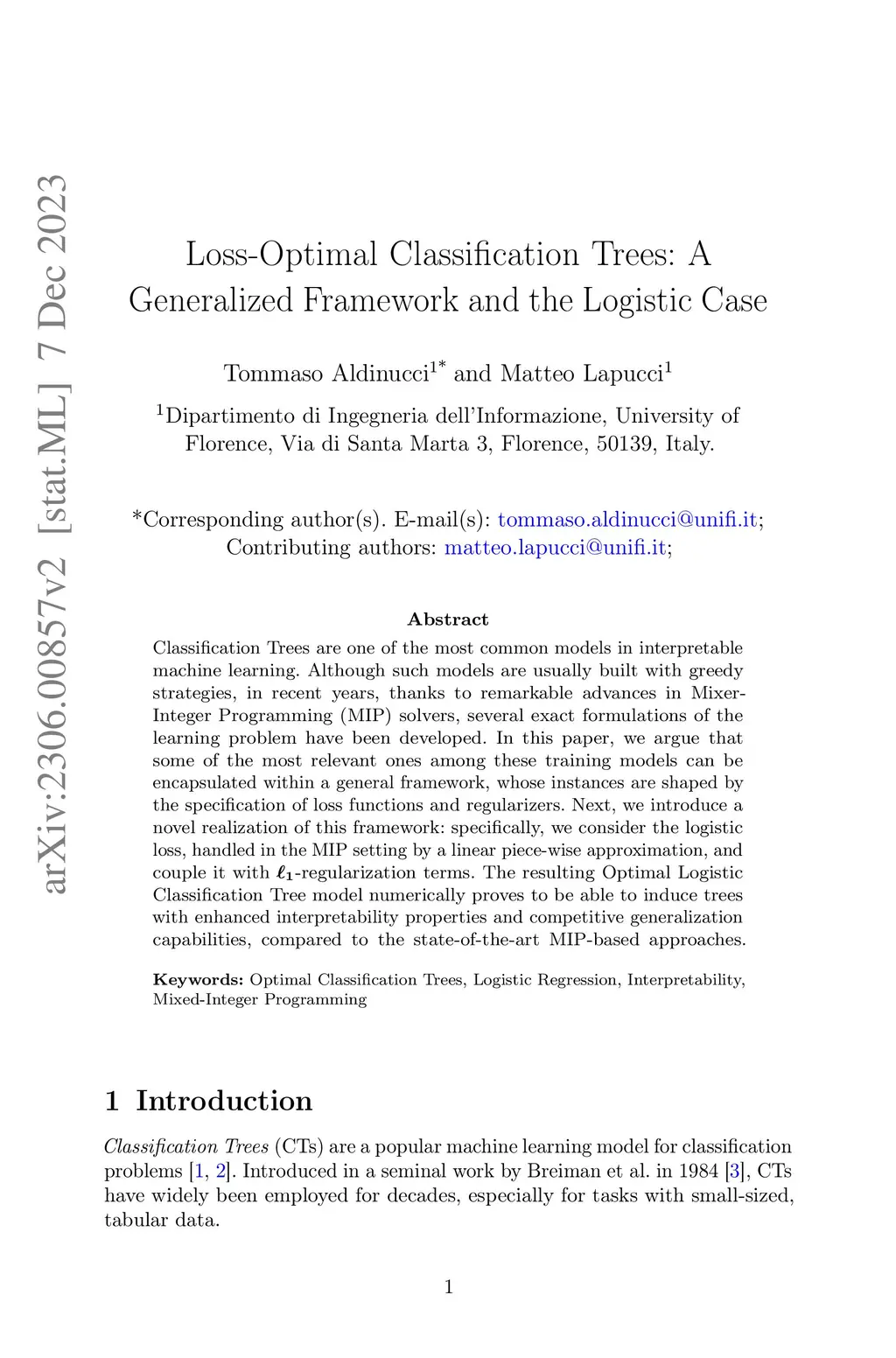 The Classification Tree (CT) is one of the most common models in interpretable machine learning. Although such models are usually built with greedy strategies, in recent years, thanks to remarkable advances in Mixer-Integer Programming (MIP) solvers, several exact formulations of the learning problem have been developed. In this paper, we argue that some of the most relevant ones among these training models can be encapsulated within a general framework, whose instances are shaped by the specification of loss functions and regularizers. Next, we introduce a novel realization of this framework: specifically, we consider the logistic loss, handled in the MIP setting by a linear piece-wise approximation, and couple it with -regularization terms. The resulting Optimal Logistic Tree model numerically proves to be able to induce trees with enhanced interpretability features and competitive generalization capabilities, compared to the state-of-the-art MIP-based approaches.