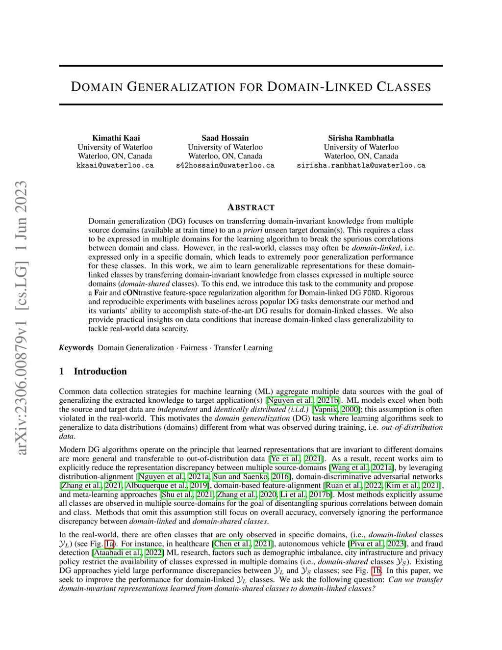 Domain generalization (DG) focuses on transferring domain-invariant knowledge from multiple source domains (available at train time) to an, a priori, unseen target domain(s). This requires a class to be expressed in multiple domains for the learning algorithm to break the spurious correlations between domain and class. However, in the real-world, classes may often be domain-linked, i.e. expressed only in a specific domain, which leads to extremely poor generalization performance for these classes. In this work, we aim to learn generalizable representations for these domain-linked classes by transferring domain-invariant knowledge from classes expressed in multiple source domains (domain-shared classes). To this end, we introduce this task to the community and propose a Fair and cONtrastive feature-space regularization algorithm for Domain-linked DG, FOND. Rigorous and reproducible experiments with baselines across popular DG tasks demonstrate our method and its variants' ability to accomplish state-of-the-art DG results for domain-linked classes. We also provide practical insights on data conditions that increase domain-linked class generalizability to tackle real-world data scarcity.