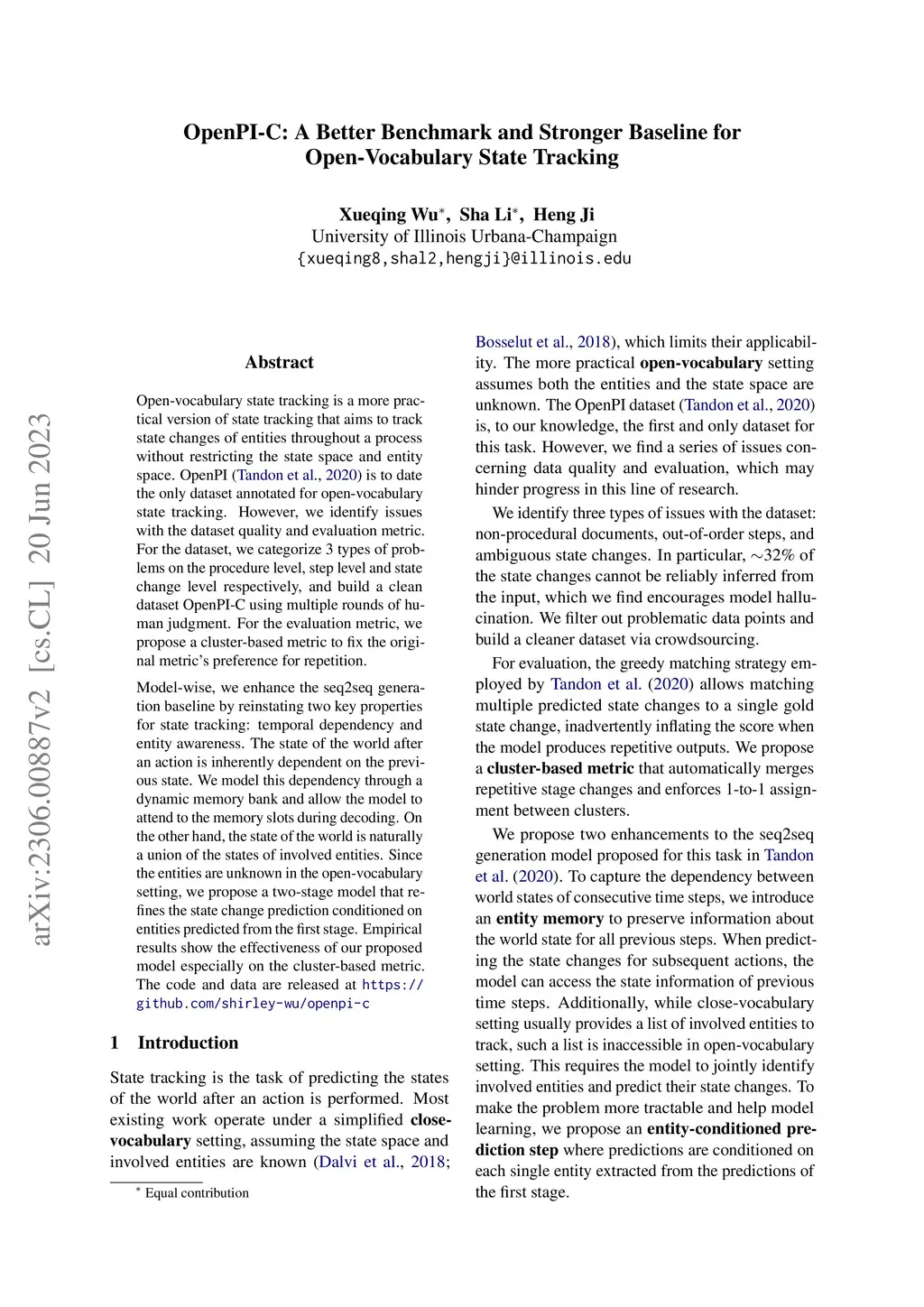 Open-vocabulary state tracking is a more practical version of state tracking that aims to track state changes of entities throughout a process without restricting the state space and entity space. OpenPI is to date the only dataset annotated for open-vocabulary state tracking. However, we identify issues with the dataset quality and evaluation metric. For the dataset, we categorize 3 types of problems on the procedure level, step level and state change level respectively, and build a clean dataset OpenPI-C using multiple rounds of human judgment. For the evaluation metric, we propose a cluster-based metric to fix the original metric's preference for repetition. Model-wise, we enhance the seq2seq generation baseline by reinstating two key properties for state tracking: temporal dependency and entity awareness. The state of the world after an action is inherently dependent on the previous state. We model this dependency through a dynamic memory bank and allow the model to attend to the memory slots during decoding. On the other hand, the state of the world is naturally a union of the states of involved entities. Since the entities are unknown in the open-vocabulary setting, we propose a two-stage model that refines the state change prediction conditioned on entities predicted from the first stage. Empirical results show the effectiveness of our proposed model especially on the cluster-based metric. The code and data are released at https://github.com/shirley-wu/openpi-c