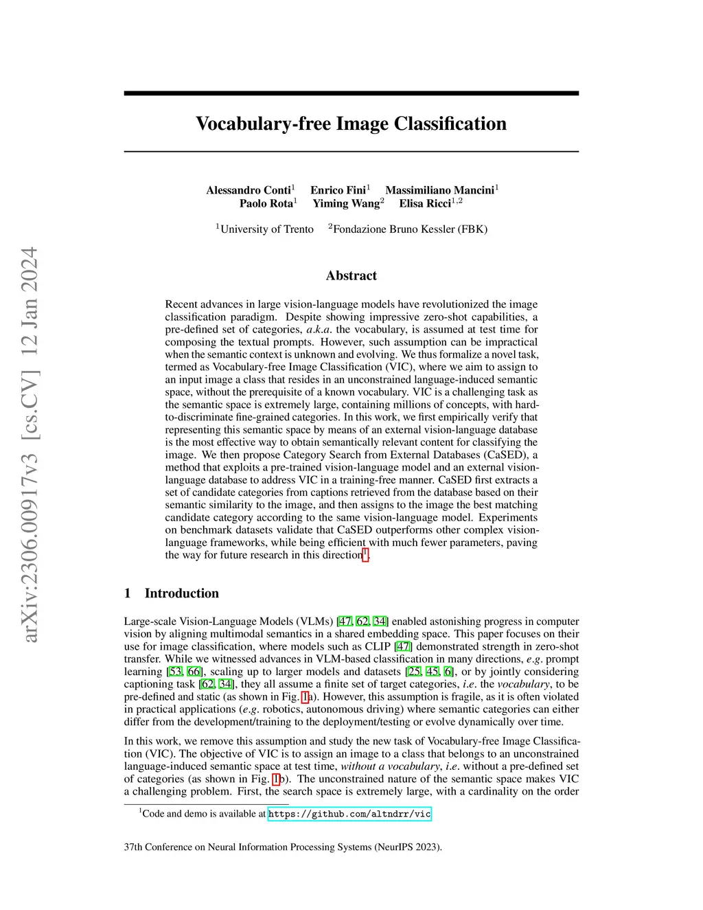 Recent advances in large vision-language models have revolutionized the image classification paradigm. Despite showing impressive zero-shot capabilities, a pre-defined set of categories, a.k.a. the vocabulary, is assumed at test time for composing the textual prompts. However, such assumption can be impractical when the semantic context is unknown and evolving. We thus formalize a novel task, termed as Vocabulary-free Image Classification (VIC), where we aim to assign to an input image a class that resides in an unconstrained language-induced semantic space, without the prerequisite of a known vocabulary. VIC is a challenging task as the semantic space is extremely large, containing millions of concepts, with hard-to-discriminate fine-grained categories. In this work, we first empirically verify that representing this semantic space by means of an external vision-language database is the most effective way to obtain semantically relevant content for classifying the image. We then propose Category Search from External Databases (CaSED), a method that exploits a pre-trained vision-language model and an external vision-language database to address VIC in a training-free manner. CaSED first extracts a set of candidate categories from captions retrieved from the database based on their semantic similarity to the image, and then assigns to the image the best matching candidate category according to the same vision-language model. Experiments on benchmark datasets validate that CaSED outperforms other complex vision-language frameworks, while being efficient with much fewer parameters, paving the way for future research in this direction.