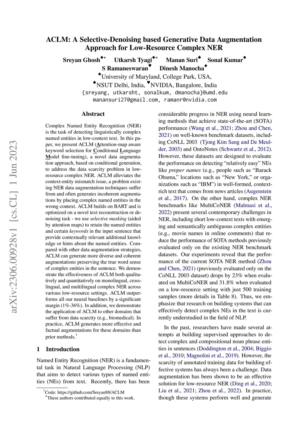 Complex Named Entity Recognition (NER) is the task of detecting linguistically complex named entities in low-context text. In this paper, we present ACLM Attention-map aware keyword selection for Conditional Language Model fine-tuning), a novel data augmentation approach based on conditional generation to address the data scarcity problem in low-resource complex NER. ACLM alleviates the context-entity mismatch issue, a problem existing NER data augmentation techniques suffer from and often generates incoherent augmentations by placing complex named entities in the wrong context. ACLM builds on BART and is optimized on a novel text reconstruction or denoising task - we use selective masking (aided by attention maps) to retain the named entities and certain keywords in the input sentence that provide contextually relevant additional knowledge or hints about the named entities. Compared with other data augmentation strategies, ACLM can generate more diverse and coherent augmentations preserving the true word sense of complex entities in the sentence. We demonstrate the effectiveness of ACLM both qualitatively and quantitatively on monolingual, cross-lingual, and multilingual complex NER across various low-resource settings. ACLM outperforms all our neural baselines by a significant margin (1%-36%). In addition, we demonstrate the application of ACLM to other domains that suffer from data scarcity (e.g., biomedical). In practice, ACLM generates more effective and factual augmentations for these domains than prior methods. Code: https://github.com/Sreyan88/ACLM