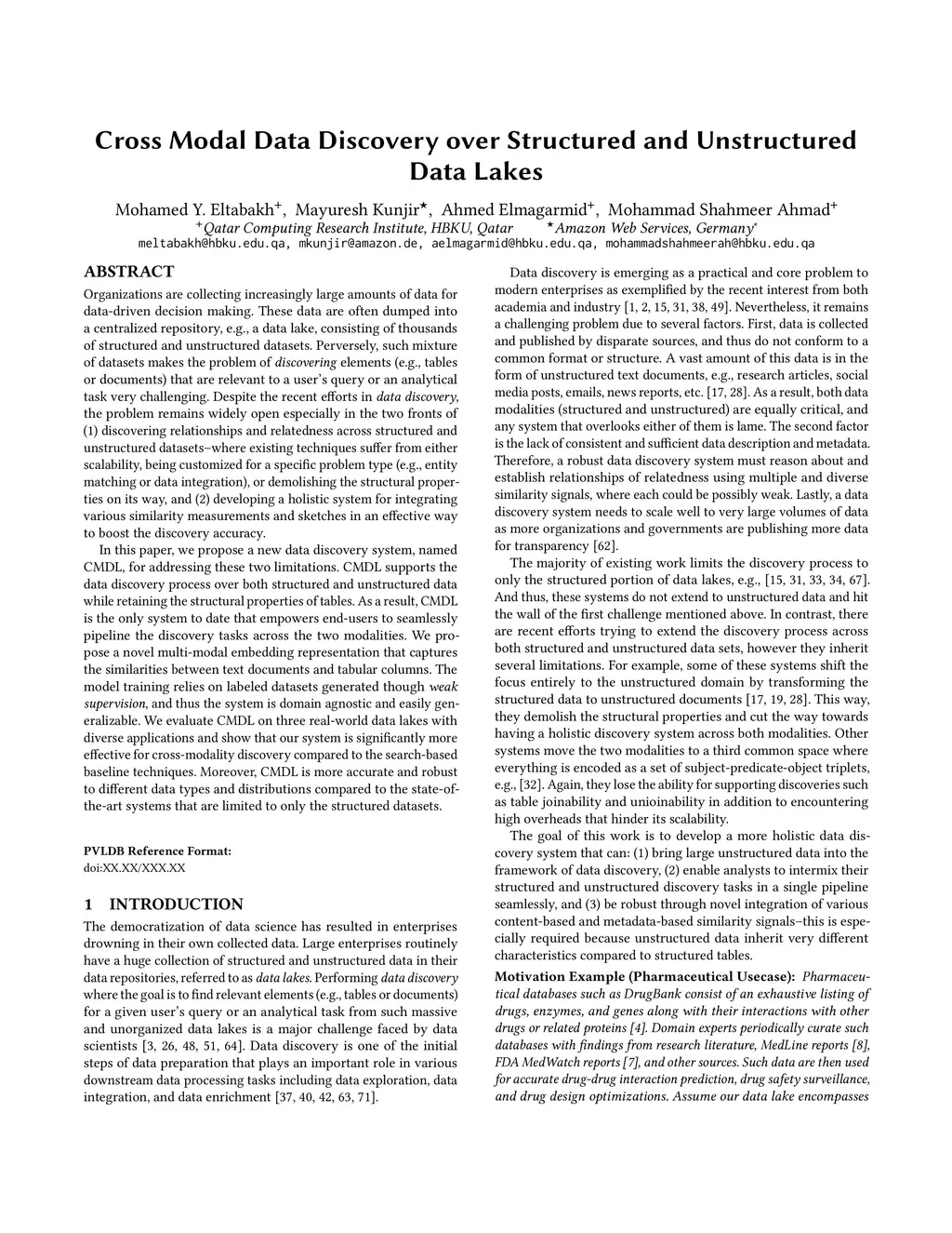 Organizations are collecting increasingly large amounts of data for data driven decision making. These data are often dumped into a centralized repository, e.g., a data lake, consisting of thousands of structured and unstructured datasets. Perversely, such mixture of datasets makes the problem of discovering elements (e.g., tables or documents) that are relevant to a user's query or an analytical task very challenging. Despite the recent efforts in data discovery, the problem remains widely open especially in the two fronts of (1) discovering relationships and relatedness across structured and unstructured datasets where existing techniques suffer from either scalability, being customized for a specific problem type (e.g., entity matching or data integration), or demolishing the structural properties on its way, and (2) developing a holistic system for integrating various similarity measurements and sketches in an effective way to boost the discovery accuracy. In this paper, we propose a new data discovery system, named CMDL, for addressing these two limitations. CMDL supports the data discovery process over both structured and unstructured data while retaining the structural properties of tables.