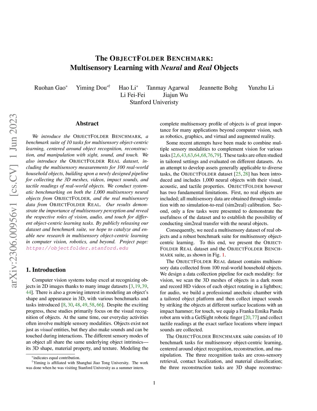 The ObjectFolder Benchmark: Multisensory Learning with Neural and Real