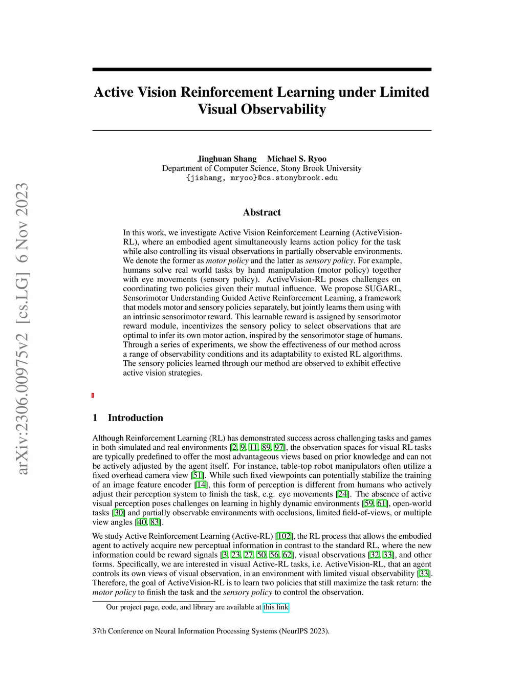 In this work, we investigate Active Vision Reinforcement Learning (ActiveVision-RL), where an embodied agent simultaneously learns action policy for the task while also controlling its visual observations in partially observable environments. We denote the former as motor policy and the latter as sensory policy. For example, humans solve real world tasks by hand manipulation (motor policy) together with eye movements (sensory policy). ActiveVision-RL poses challenges on coordinating two policies given their mutual influence. We propose SUGARL, Sensorimotor Understanding Guided Active Reinforcement Learning, a framework that models motor and sensory policies separately, but jointly learns them using with an intrinsic sensorimotor reward. This learnable reward is assigned by sensorimotor reward module, incentivizes the sensory policy to select observations that are optimal to infer its own motor action, inspired by the sensorimotor stage of humans. Through a series of experiments, we show the effectiveness of our method across a range of observability conditions and its adaptability to existed RL algorithms. The sensory policies learned through our method are observed to exhibit effective active vision strategies.