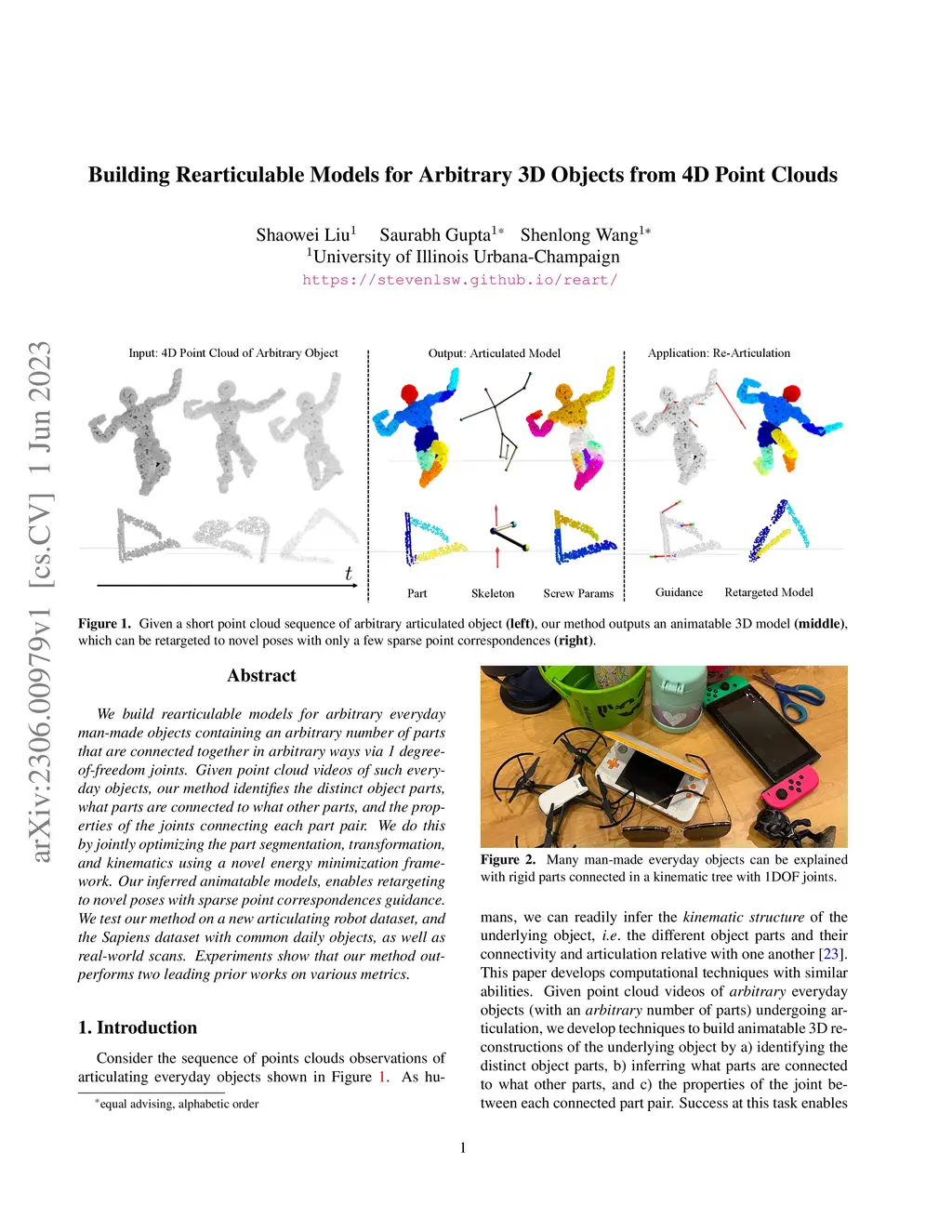 We build rearticulable models for arbitrary everyday man-made objects containing an arbitrary number of parts that are connected together in arbitrary ways via 1 degree-of-freedom joints. Given point cloud videos of such everyday objects, our method identifies the distinct object parts, what parts are connected to what other parts, and the properties of the joints connecting each part pair. We do this by jointly optimizing the part segmentation, transformation, and kinematics using a novel energy minimization framework. Our inferred animatable models, enables retargeting to novel poses with sparse point correspondences guidance. We test our method on a new articulating robot dataset, and the Sapiens dataset with common daily objects, as well as real-world scans. Experiments show that our method outperforms two leading prior works on various metrics.