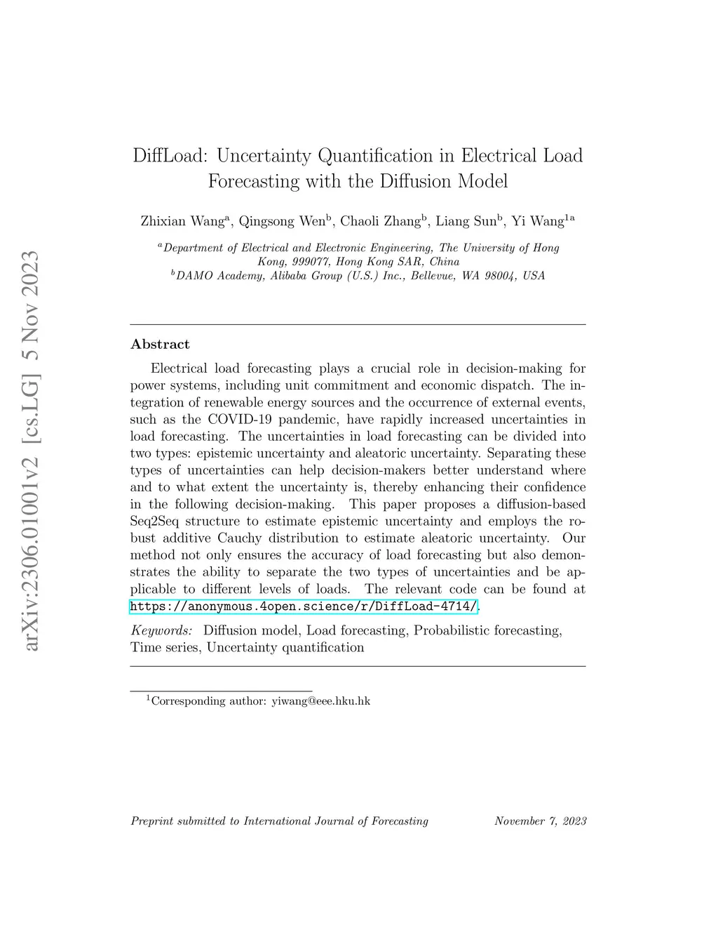 Electrical load forecasting plays a crucial role in decision-making for power systems, including unit commitment and economic dispatch. The integration of renewable energy sources and the occurrence of external events, such as the COVID-19 pandemic, have rapidly increased uncertainties in load forecasting. The uncertainties in load forecasting can be divided into two types: epistemic uncertainty and aleatoric uncertainty. Separating these types of uncertainties can help decision-makers better understand where and to what extent the uncertainty is, thereby enhancing their confidence in the following decision-making. This paper proposes a diffusion-based Seq2Seq structure to estimate epistemic uncertainty and employs the robust additive Cauchy distribution to estimate aleatoric uncertainty. Our method not only ensures the accuracy of load forecasting but also demonstrates the ability to separate the two types of uncertainties and be applicable to different levels of loads. The relevant code can be found at \url{https://anonymous.4open.science/r/DiffLoad-4714/}.