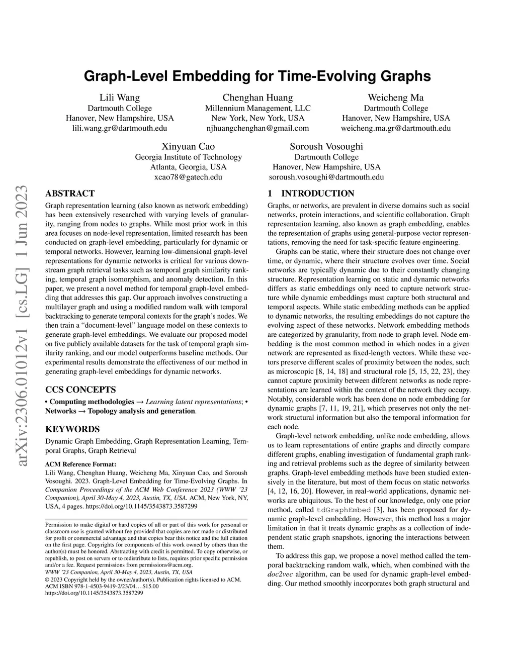 Graph representation learning (also known as network embedding) has been extensively researched with varying levels of granularity, ranging from nodes to graphs. While most prior work in this area focuses on node-level representation, limited research has been conducted on graph-level embedding, particularly for dynamic or temporal networks. However, learning low-dimensional graph-level representations for dynamic networks is critical for various downstream graph retrieval tasks such as temporal graph similarity ranking, temporal graph isomorphism, and anomaly detection. In this paper, we present a novel method for temporal graph-level embedding that addresses this gap. Our approach involves constructing a multilayer graph and using a modified random walk with temporal backtracking to generate temporal contexts for the graph's nodes. We then train a "document-level" language model on these contexts to generate graph-level embeddings. We evaluate our proposed model on five publicly available datasets for the task of temporal graph similarity ranking, and our model outperforms baseline methods. Our experimental results demonstrate the effectiveness of our method in generating graph-level embeddings for dynamic networks.