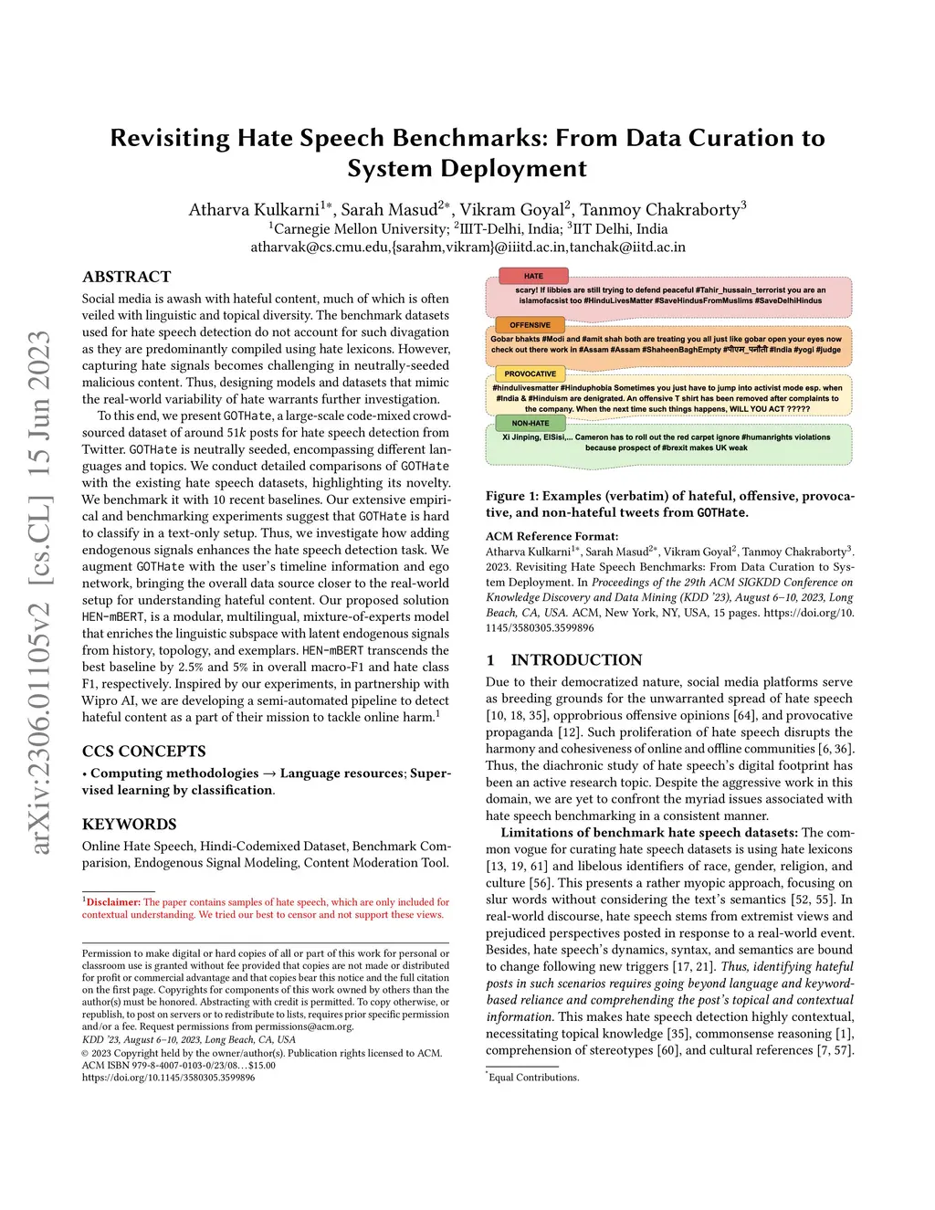 Social media is awash with hateful content, much of which is often veiled with linguistic and topical diversity. The benchmark datasets used for hate speech detection do not account for such divagation as they are predominantly compiled using hate lexicons. However, capturing hate signals becomes challenging in neutrally-seeded malicious content. Thus, designing models and datasets that mimic the real-world variability of hate warrants further investigation. To this end, we present GOTHate, a large-scale code-mixed crowdsourced dataset of around 51k posts for hate speech detection from Twitter. GOTHate is neutrally seeded, encompassing different languages and topics. We conduct detailed comparisons of GOTHate with the existing hate speech datasets, highlighting its novelty. We benchmark it with 10 recent baselines. Our extensive empirical and benchmarking experiments suggest that GOTHate is hard to classify in a text-only setup. Thus, we investigate how adding endogenous signals enhances the hate speech detection task. We augment GOTHate with the user's timeline information and ego network, bringing the overall data source closer to the real-world setup for understanding hateful content. Our proposed solution HEN-mBERT is a modular, multilingual, mixture-of-experts model that enriches the linguistic subspace with latent endogenous signals from history, topology, and exemplars. HEN-mBERT transcends the best baseline by 2.5% and 5% in overall macro-F1 and hate class F1, respectively. Inspired by our experiments, in partnership with Wipro AI, we are developing a semi-automated pipeline to detect hateful content as a part of their mission to tackle online harm.