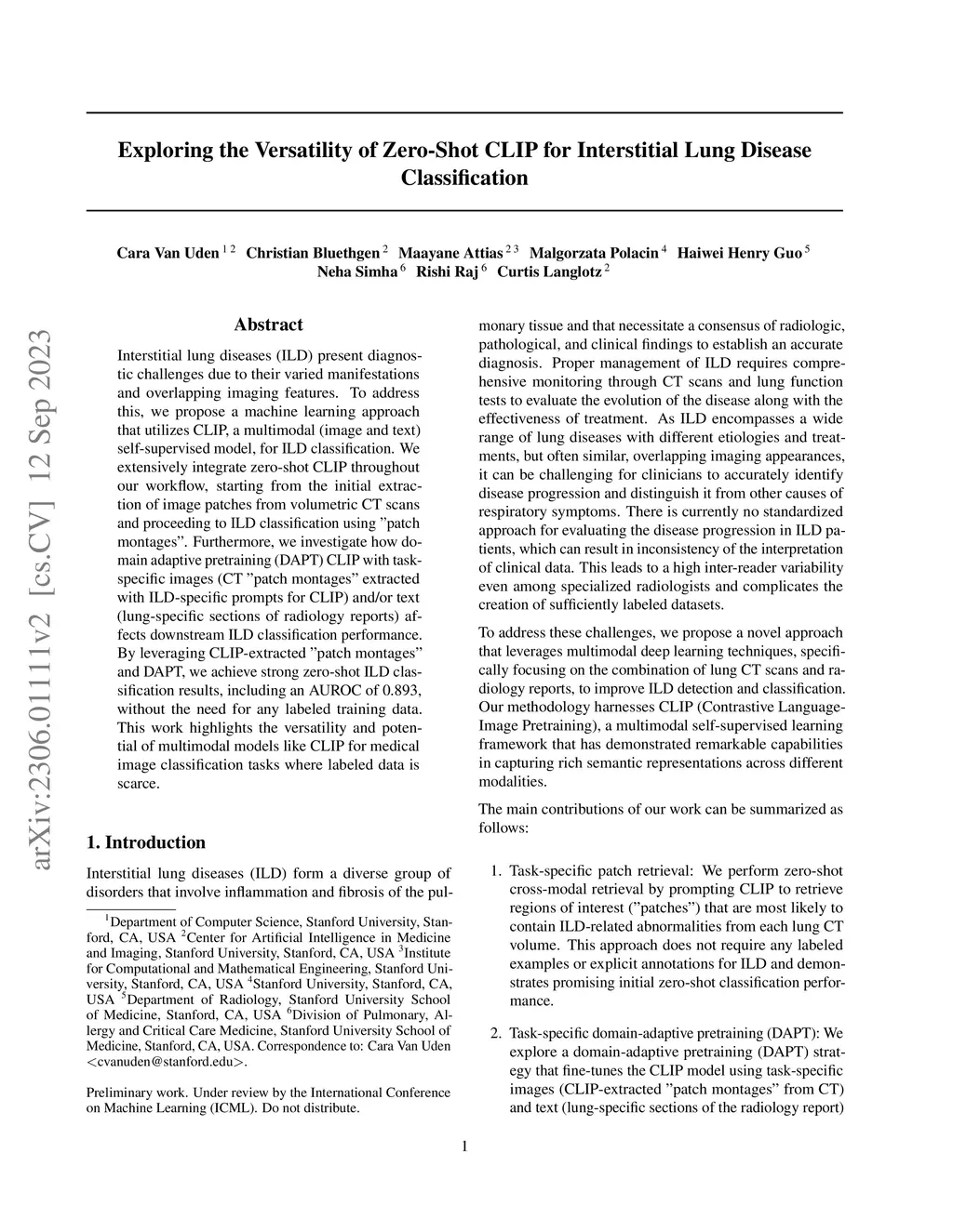 Interstitial lung diseases (ILD) present diagnostic challenges due to their varied manifestations and overlapping imaging features. To address this, we propose a machine learning approach that utilizes CLIP, a multimodal (image and text) self-supervised model, for ILD classification. We extensively integrate zero-shot CLIP throughout our workflow, starting from the initial extraction of image patches from volumetric CT scans and proceeding to ILD classification using "patch montages". Furthermore, we investigate how domain adaptive pretraining (DAPT) CLIP with task-specific images (CT "patch montages" extracted with ILD-specific prompts for CLIP) and/or text (lung-specific sections of radiology reports) affects downstream ILD classification performance. By leveraging CLIP-extracted "patch montages" and DAPT, we achieve strong zero-shot ILD classification results, including an AUROC of 0.893, without the need for any labeled training data. This work highlights the versatility and potential of multimodal models like CLIP for medical image classification tasks where labeled data is scarce.
