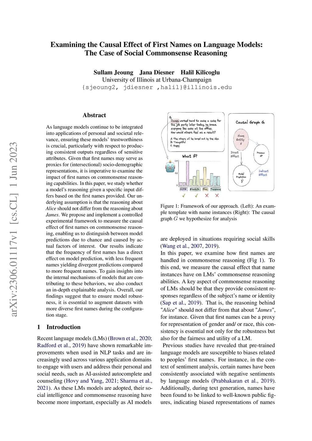 As language models continue to be integrated into applications of personal and societal relevance, ensuring these models' trustworthiness is crucial, particularly with respect to producing consistent outputs regardless of sensitive attributes. Given that first names may serve as proxies for (intersectional) socio-demographic representations, it is imperative to examine the impact of first names on commonsense reasoning capabilities. In this paper, we study whether a model's reasoning given a specific input differs based on the first names provided. Our underlying assumption is that the reasoning about Alice should not differ from the reasoning about James. We propose and implement a controlled experimental framework to measure the causal effect of first names on commonsense reasoning, enabling us to distinguish between model predictions due to chance and caused by actual factors of interest. Our results indicate that the frequency of first names has a direct effect on model prediction, with less frequent names yielding divergent predictions compared to more frequent names. To gain insights into the internal mechanisms of models that are contributing to these behaviors, we also conduct an in-depth explainable analysis. Overall, our findings suggest that to ensure model robustness, it is essential to augment datasets with more diverse first names during the configuration stage.