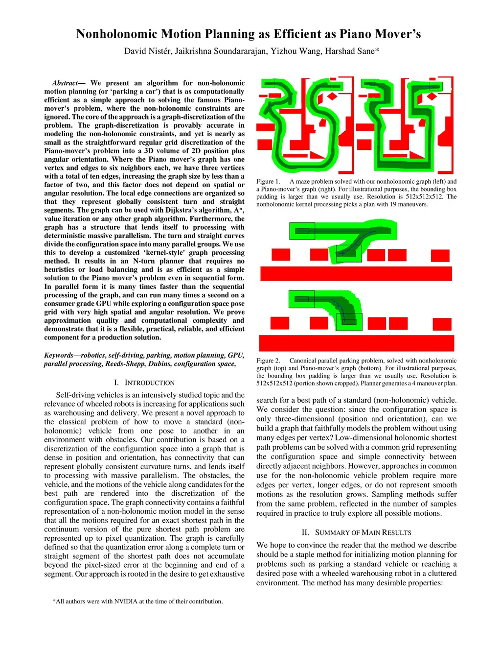 We present an algorithm for non-holonomic motion planning (or 'parking a car') that is as computationally efficient as a simple approach to solving the famous Piano-mover's problem, where the non-holonomic constraints are ignored. The core of the approach is a graph-discretization of the problem. The graph-discretization is provably accurate in modeling the non-holonomic constraints, and yet is nearly as small as the straightforward regular grid discretization of the Piano-mover's problem into a 3D volume of 2D position plus angular orientation. Where the Piano mover's graph has one vertex and edges to six neighbors each, we have three vertices with a total of ten edges, increasing the graph size by less than a factor of two, and this factor does not depend on spatial or angular resolution. The local edge connections are organized so that they represent globally consistent turn and straight segments. The graph can be used with Dijkstra's algorithm, A*, value iteration or any other graph algorithm. Furthermore, the graph has a structure that lends itself to processing with deterministic massive parallelism. The turn and straight curves divide the configuration space into many parallel groups. We use this to develop a customized 'kernel-style' graph processing method. It results in an N-turn planner that requires no heuristics or load balancing and is as efficient as a simple solution to the Piano mover's problem even in sequential form. In parallel form it is many times faster than the sequential processing of the graph, and can run many times a second on a consumer grade GPU while exploring a configuration space pose grid with very high spatial and angular resolution. We prove approximation quality and computational complexity and demonstrate that it is a flexible, practical, reliable, and efficient component for a production solution.