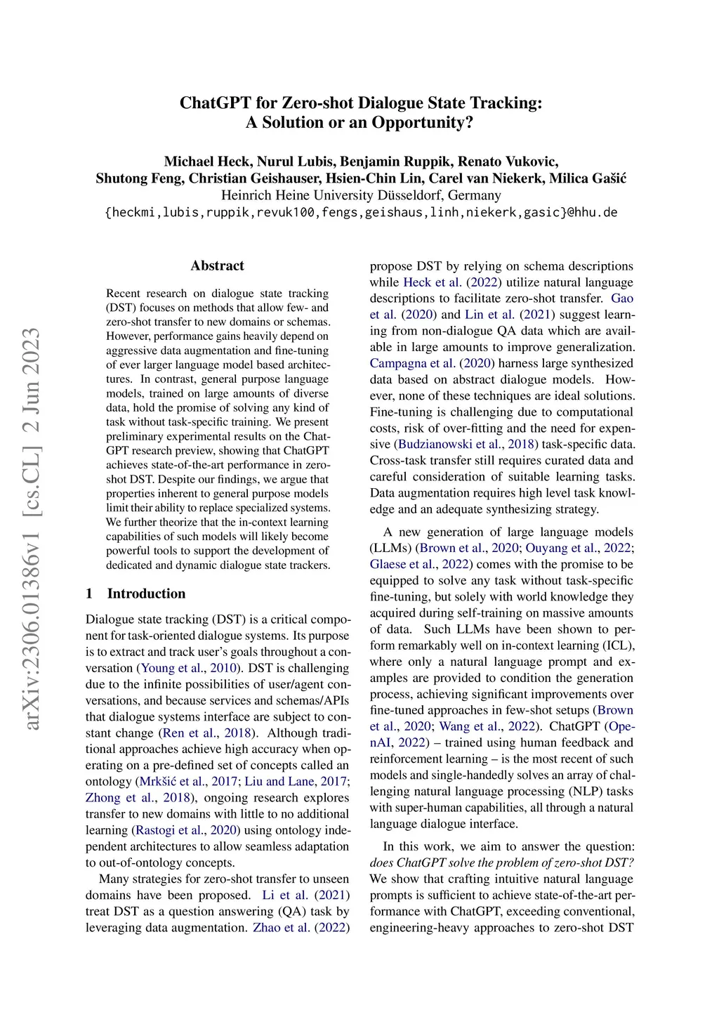 Recent research on dialogue state tracking (DST) focuses on methods that allow few- and zero-shot transfer to new domains or schemas. However, performance gains heavily depend on aggressive data augmentation and fine-tuning of ever larger language model based architectures. In contrast, general purpose language models, trained on large amounts of diverse data, hold the promise of solving any kind of task without task-specific training. We present preliminary experimental results on the ChatGPT research preview, showing that ChatGPT achieves state-of-the-art performance in zero-shot DST. Despite our findings, we argue that properties inherent to general purpose models limit their ability to replace specialized systems. We further theorize that the in-context learning capabilities of such models will likely become powerful tools to support the development of dedicated and dynamic dialogue state trackers.