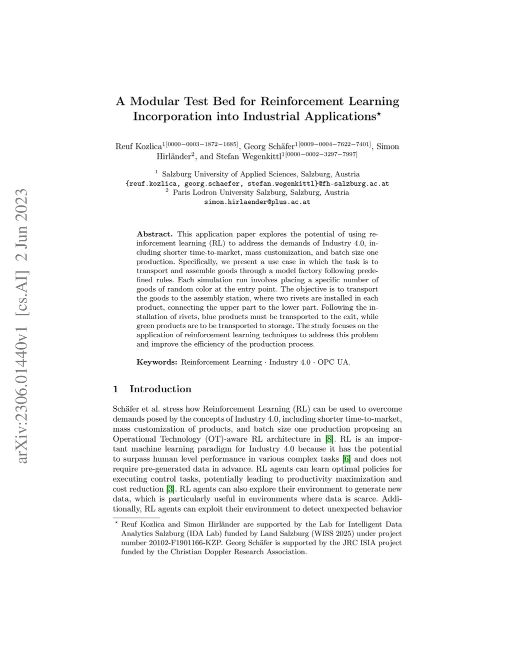 This application paper explores the potential of using reinforcement learning (RL) to address the demands of Industry 4.0, including shorter time-to-market, mass customization, and batch size one production. Specifically, we present a use case in which the task is to transport and assemble goods through a model factory following predefined rules. Each simulation run involves placing a specific number of goods of random color at the entry point. The objective is to transport the goods to the assembly station, where two rivets are installed in each product, connecting the upper part to the lower part. Following the installation of rivets, blue products must be transported to the exit, while green products are to be transported to storage. The study focuses on the application of reinforcement learning techniques to address this problem and improve the efficiency of the production process.