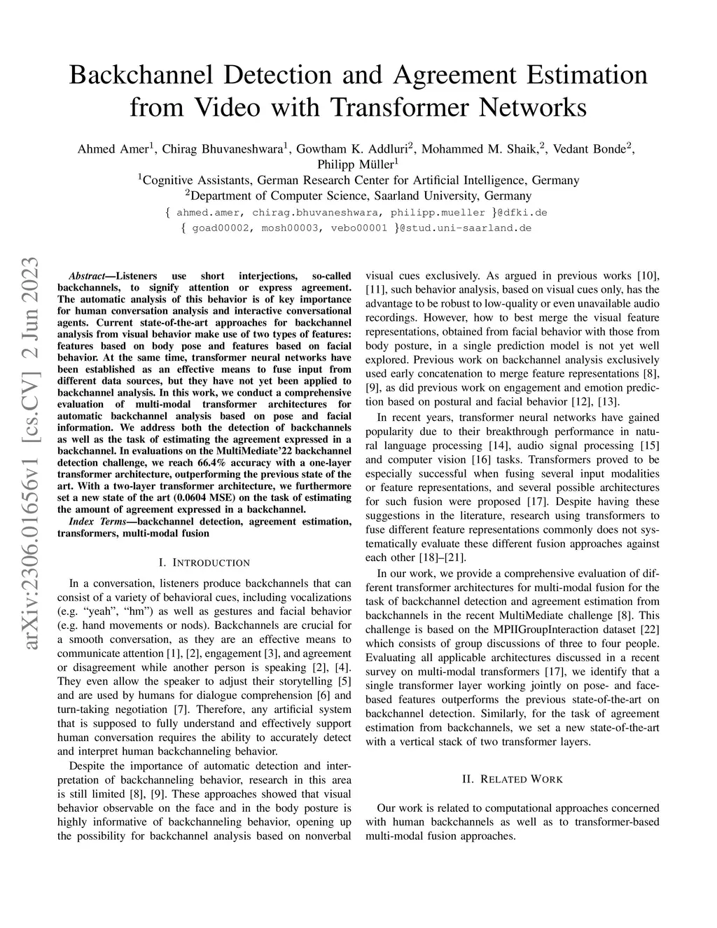 Listeners use short interjections, so-called backchannels, to signify attention or express agreement. The automatic analysis of this behavior is of key importance for human conversation analysis and interactive conversational agents. Current state-of-the-art approaches for backchannel analysis from visual behavior make use of two types of features: features based on body pose and features based on facial behavior. At the same time, transformer neural networks have been established as an effective means to fuse input from different data sources, but they have not yet been applied to backchannel analysis. In this work, we conduct a comprehensive evaluation of multi-modal transformer architectures for automatic backchannel analysis based on pose and facial information. We address both the detection of backchannels as well as the task of estimating the agreement expressed in a backchannel. In evaluations on the MultiMediate'22 backchannel detection challenge, we reach 66.4% accuracy with a one-layer transformer architecture, outperforming the previous state of the art. With a two-layer transformer architecture, we furthermore set a new state of the art (0.0604 MSE) on the task of estimating the amount of agreement expressed in a backchannel.
