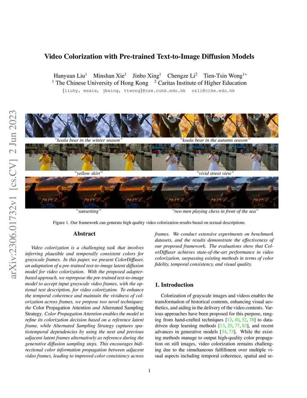 Video colorization is a challenging task that involves inferring plausible and temporally consistent colors for grayscale frames. In this paper, we present ColorDiffuser, an adaptation of a pre-trained text-to-image latent diffusion model for video colorization. With the proposed adapter-based approach, we repropose the pre-trained text-to-image model to accept input grayscale video frames, with the optional text description, for video colorization. To enhance the temporal coherence and maintain the vividness of colorization across frames, we propose two novel techniques: the Color Propagation Attention and Alternated Sampling Strategy. Color Propagation Attention enables the model to refine its colorization decision based on a reference latent frame, while Alternated Sampling Strategy captures spatiotemporal dependencies by using the next and previous adjacent latent frames alternatively as reference during the generative diffusion sampling steps. This encourages bidirectional color information propagation between adjacent video frames, leading to improved color consistency across frames. We conduct extensive experiments on benchmark datasets, and the results demonstrate the effectiveness of our proposed framework. The evaluations show that ColorDiffuser achieves state-of-the-art performance in video colorization, surpassing existing methods in terms of color fidelity, temporal consistency, and visual quality.
