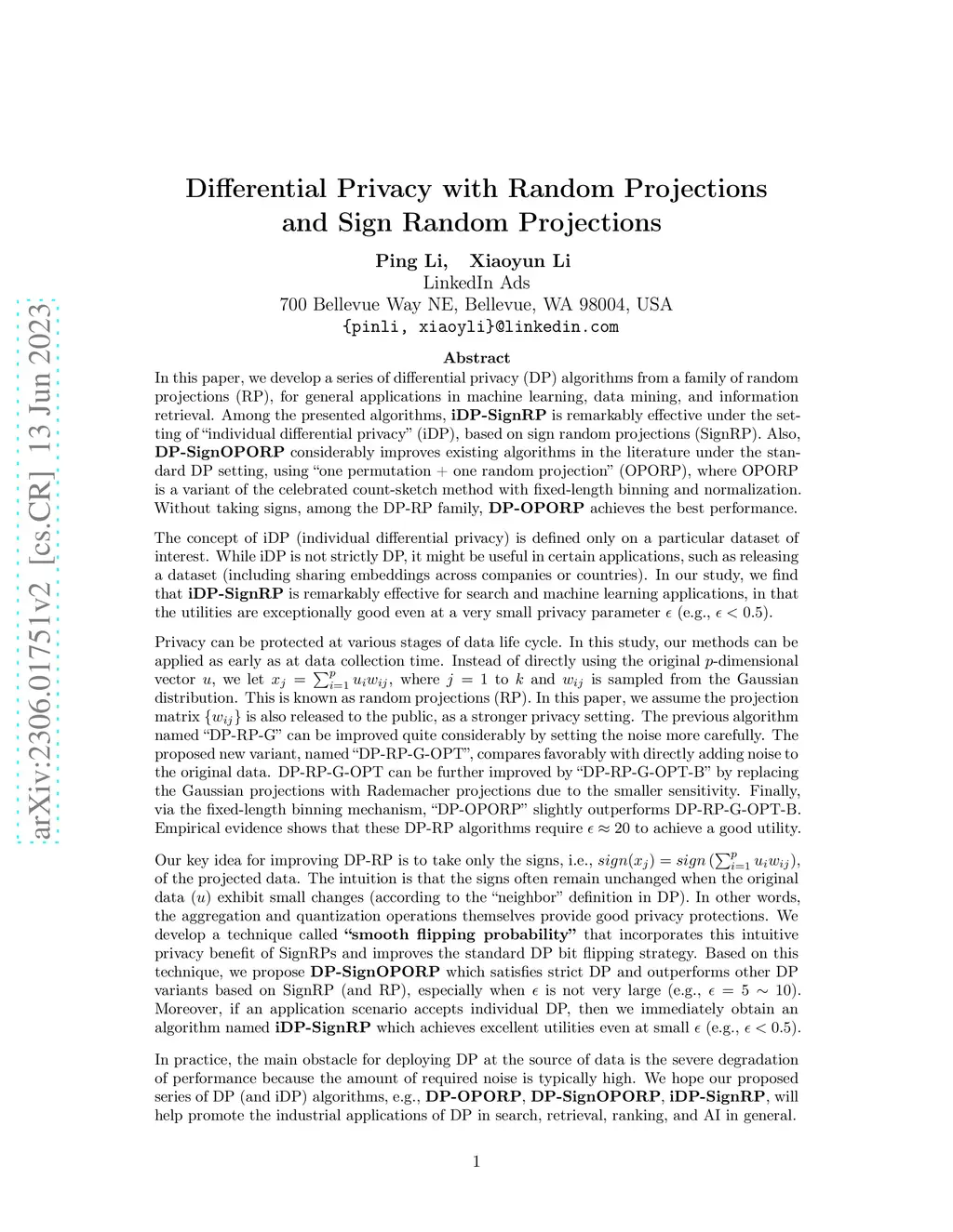 In this paper, we develop a series of differential privacy (DP) algorithms from a family of random projections (RP) for general applications in machine learning, data mining, and information retrieval. Among the presented algorithms, iDP-SignRP is remarkably effective under the setting of ``individual differential privacy'' (iDP), based on sign random projections (SignRP). Also, DP-SignOPORP considerably improves existing algorithms in the literature under the standard DP setting, using ``one permutation + one random projection'' (OPORP), where OPORP is a variant of the celebrated count-sketch method with fixed-length binning and normalization. Without taking signs, among the DP-RP family, DP-OPORP achieves the best performance. Our key idea for improving DP-RP is to take only the signs, i.e., , of the projected data. The intuition is that the signs often remain unchanged when the original data () exhibit small changes (according to the ``neighbor'' definition in DP). In other words, the aggregation and quantization operations themselves provide good privacy protections. We develop a technique called ``smooth flipping probability'' that incorporates this intuitive privacy benefit of SignRPs and improves the standard DP bit flipping strategy. Based on this technique, we propose DP-SignOPORP which satisfies strict DP and outperforms other DP variants based on SignRP (and RP), especially when is not very large (e.g., ). Moreover, if an application scenario accepts individual DP, then we immediately obtain an algorithm named iDP-SignRP which achieves excellent utilities even at small~ (e.g., ).