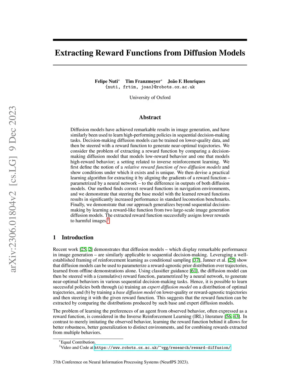 Diffusion models have achieved remarkable results in image generation, and have similarly been used to learn high-performing policies in sequential decision-making tasks. Decision-making diffusion models can be trained on lower-quality data, and then be steered with a reward function to generate near-optimal trajectories. We consider the problem of extracting a reward function by comparing a decision-making diffusion model that models low-reward behavior and one that models high-reward behavior; a setting related to inverse reinforcement learning. We first define the notion of a relative reward function of two diffusion models and show conditions under which it exists and is unique. We then devise a practical learning algorithm for extracting it by aligning the gradients of a reward function -- parametrized by a neural network -- to the difference in outputs of both diffusion models. Our method finds correct reward functions in navigation environments, and we demonstrate that steering the base model with the learned reward functions results in significantly increased performance in standard locomotion benchmarks. Finally, we demonstrate that our approach generalizes beyond sequential decision-making by learning a reward-like function from two large-scale image generation diffusion models. The extracted reward function successfully assigns lower rewards to harmful images.