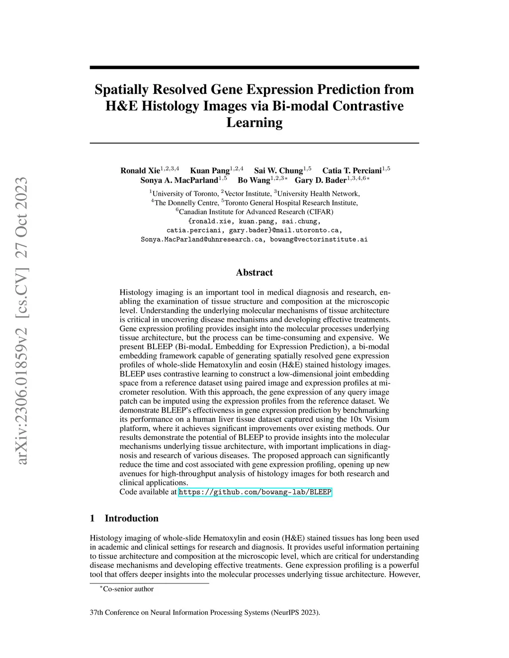 Histology imaging is an important tool in medical diagnosis and research, enabling the examination of tissue structure and composition at the microscopic level. Understanding the underlying molecular mechanisms of tissue architecture is critical in uncovering disease mechanisms and developing effective treatments. Gene expression profiling provides insight into the molecular processes underlying tissue architecture, but the process can be time-consuming and expensive. We present BLEEP (Bi-modaL Embedding for Expression Prediction), a bi-modal embedding framework capable of generating spatially resolved gene expression profiles of whole-slide Hematoxylin and eosin (H&E) stained histology images. BLEEP uses contrastive learning to construct a low-dimensional joint embedding space from a reference dataset using paired image and expression profiles at micrometer resolution. With this approach, the gene expression of any query image patch can be imputed using the expression profiles from the reference dataset. We demonstrate BLEEP's effectiveness in gene expression prediction by benchmarking its performance on a human liver tissue dataset captured using the 10x Visium platform, where it achieves significant improvements over existing methods. Our results demonstrate the potential of BLEEP to provide insights into the molecular mechanisms underlying tissue architecture, with important implications in diagnosis and research of various diseases. The proposed approach can significantly reduce the time and cost associated with gene expression profiling, opening up new avenues for high-throughput analysis of histology images for both research and clinical applications.