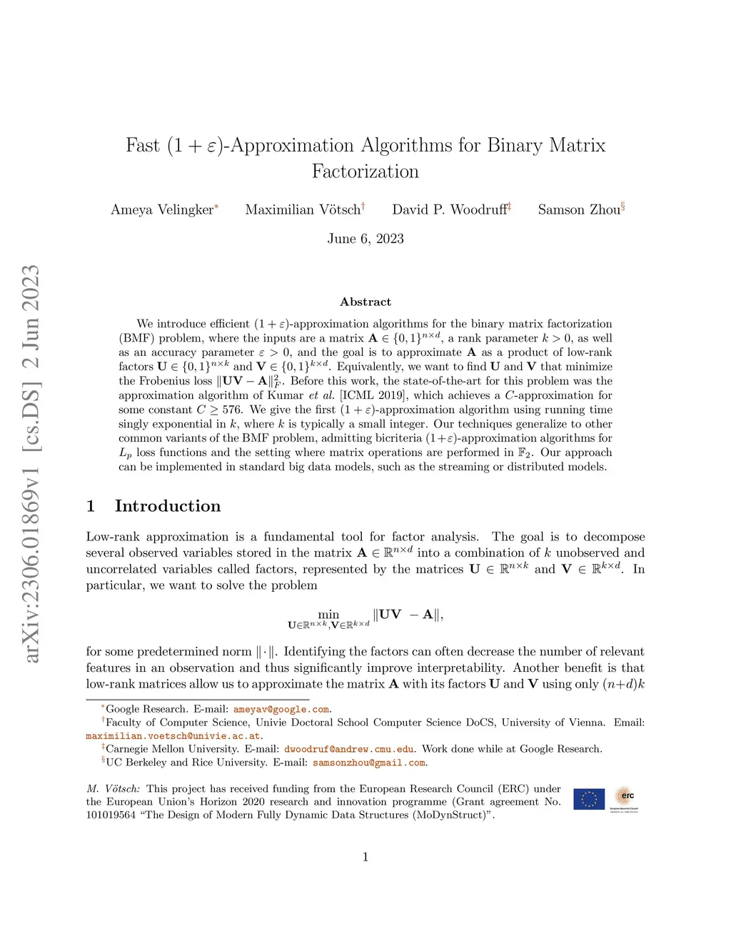 We introduce efficient -approximation algorithms for the binary matrix factorization (BMF) problem, where the inputs are a matrix , a rank parameter , as well as an accuracy parameter , and the goal is to approximate as a product of low-rank factors and . Equivalently, we want to find and that minimize the Frobenius loss . Before this work, the state-of-the-art for this problem was the approximation algorithm of Kumar et. al. [ICML 2019], which achieves a -approximation for some constant . We give the first -approximation algorithm using running time singly exponential in , where is typically a small integer. Our techniques generalize to other common variants of the BMF problem, admitting bicriteria -approximation algorithms for loss functions and the setting where matrix operations are performed in . Our approach can be implemented in standard big data models, such as the streaming or distributed models.