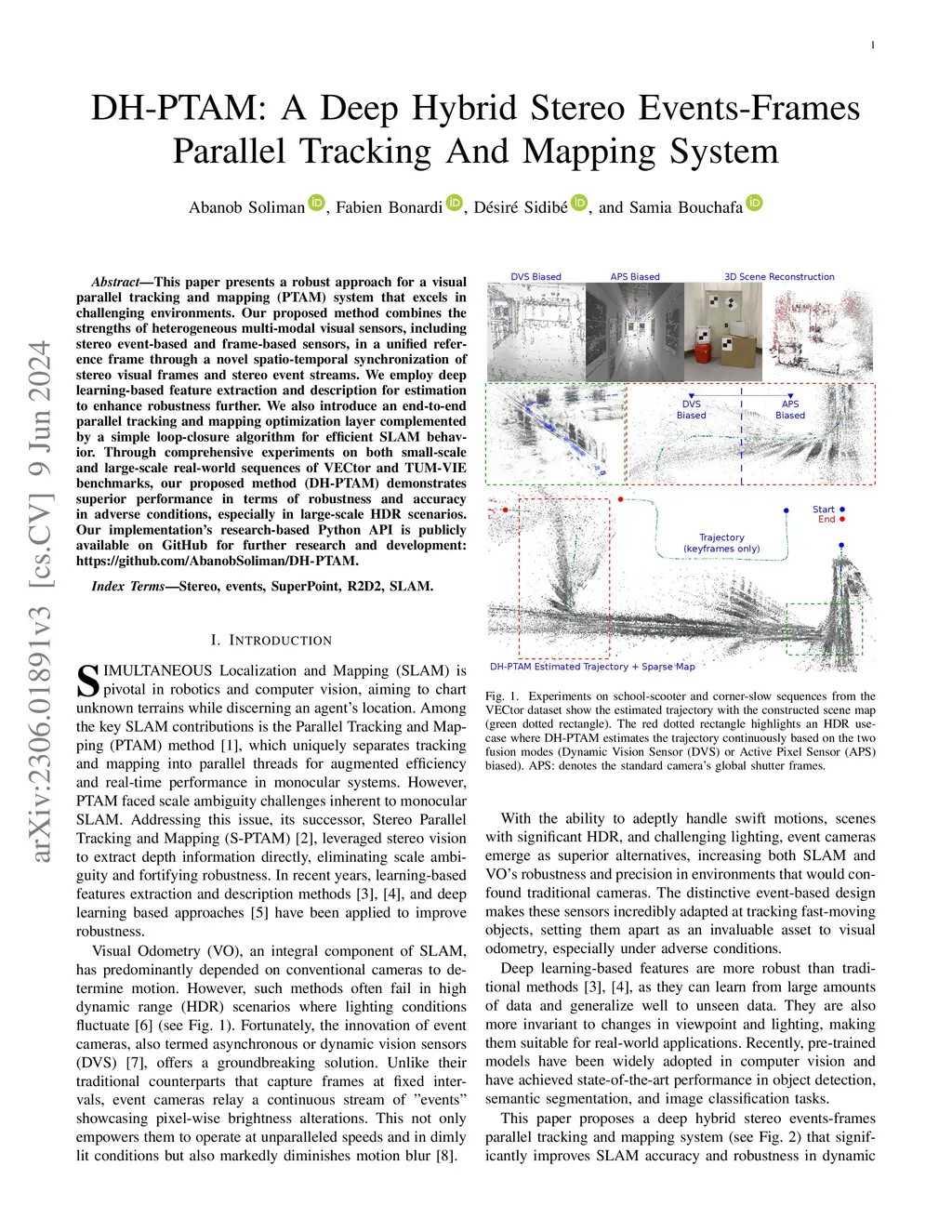 This paper presents a robust approach for a visual parallel tracking and mapping (PTAM) system that excels in challenging environments. Our proposed method combines the strengths of heterogeneous multi-modal visual sensors, including stereo event-based and frame-based sensors, in a unified reference frame through a novel spatio-temporal synchronization of stereo visual frames and stereo event streams. We employ deep learning-based feature extraction and description for estimation to enhance robustness further. We also introduce an end-to-end parallel tracking and mapping optimization layer complemented by a simple loop-closure algorithm for efficient SLAM behavior. Through comprehensive experiments on both small-scale and large-scale real-world sequences of VECtor and TUM-VIE benchmarks, our proposed method (DH-PTAM) demonstrates superior performance in terms of robustness and accuracy in adverse conditions, especially in large-scale HDR scenarios. Our implementation's research-based Python API is publicly available on GitHub for further research and development: https://github.com/AbanobSoliman/DH-PTAM.