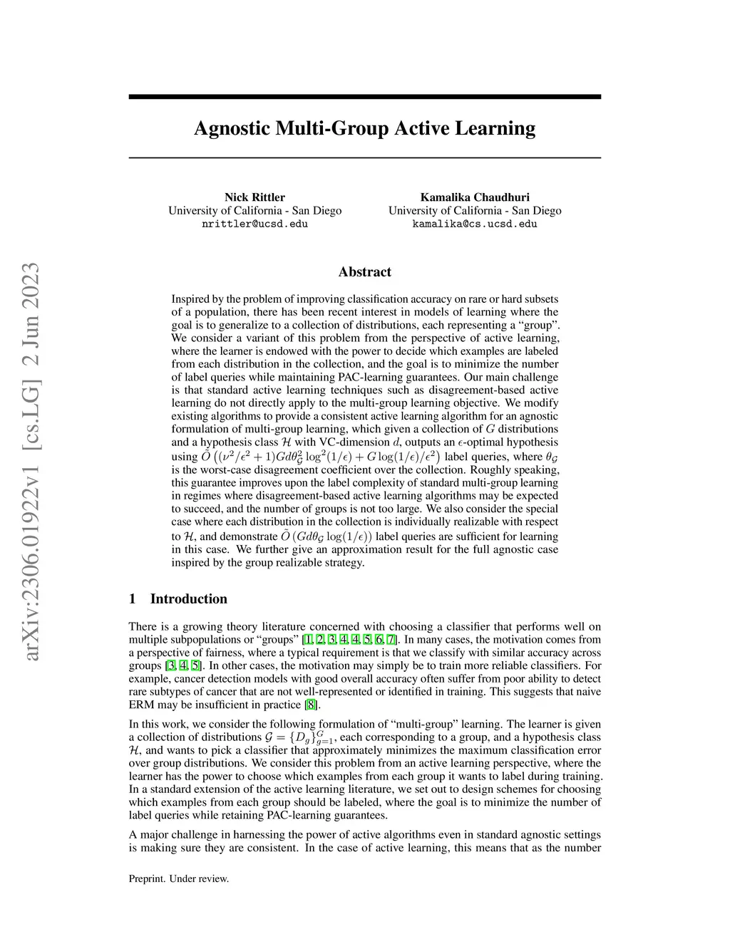 Inspired by the problem of improving classification accuracy on rare or hard subsets of a population, there has been recent interest in models of learning where the goal is to generalize to a collection of distributions, each representing a ``group''. We consider a variant of this problem from the perspective of active learning, where the learner is endowed with the power to decide which examples are labeled from each distribution in the collection, and the goal is to minimize the number of label queries while maintaining PAC-learning guarantees. Our main challenge is that standard active learning techniques such as disagreement-based active learning do not directly apply to the multi-group learning objective. We modify existing algorithms to provide a consistent active learning algorithm for an agnostic formulation of multi-group learning, which given a collection of distributions and a hypothesis class with VC-dimension , outputs an -optimal hypothesis using label queries, where is the worst-case disagreement coefficient over the collection. Roughly speaking, this guarantee improves upon the label complexity of standard multi-group learning in regimes where disagreement-based active learning algorithms may be expected to succeed, and the number of groups is not too large. We also consider the special case where each distribution in the collection is individually realizable with respect to , and demonstrate label queries are sufficient for learning in this case. We further give an approximation result for the full agnostic case inspired by the group realizable strategy.