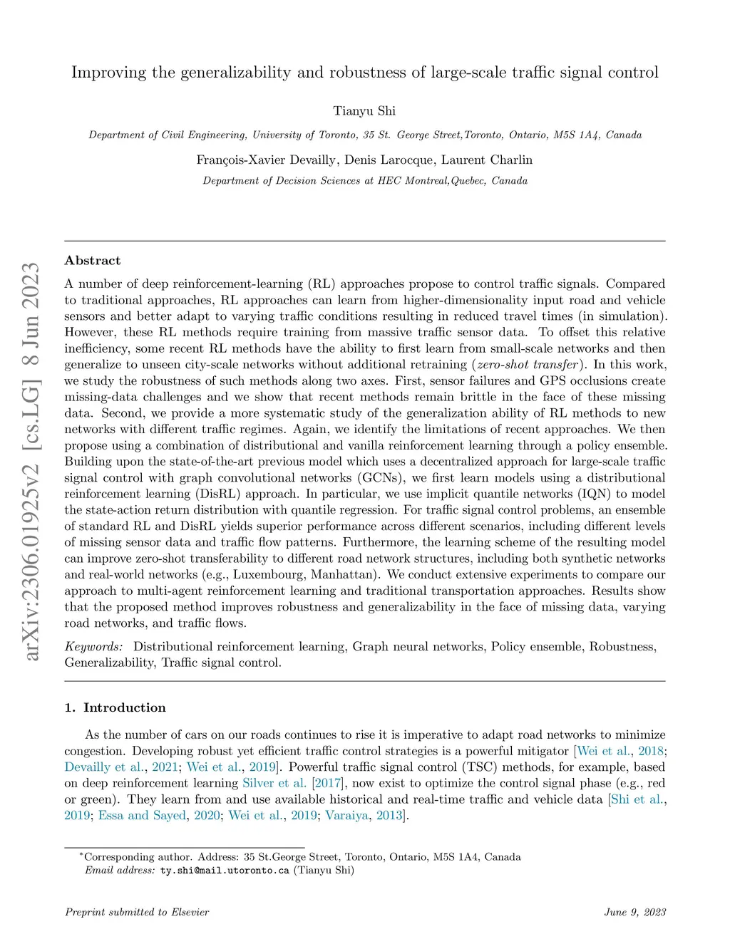A number of deep reinforcement-learning (RL) approaches propose to control traffic signals. In this work, we study the robustness of such methods along two axes. First, sensor failures and GPS occlusions create missing-data challenges and we show that recent methods remain brittle in the face of these missing data. Second, we provide a more systematic study of the generalization ability of RL methods to new networks with different traffic regimes. Again, we identify the limitations of recent approaches. We then propose using a combination of distributional and vanilla reinforcement learning through a policy ensemble. Building upon the state-of-the-art previous model which uses a decentralized approach for large-scale traffic signal control with graph convolutional networks (GCNs), we first learn models using a distributional reinforcement learning (DisRL) approach. In particular, we use implicit quantile networks (IQN) to model the state-action return distribution with quantile regression. For traffic signal control problems, an ensemble of standard RL and DisRL yields superior performance across different scenarios, including different levels of missing sensor data and traffic flow patterns. Furthermore, the learning scheme of the resulting model can improve zero-shot transferability to different road network structures, including both synthetic networks and real-world networks (e.g., Luxembourg, Manhattan). We conduct extensive experiments to compare our approach to multi-agent reinforcement learning and traditional transportation approaches. Results show that the proposed method improves robustness and generalizability in the face of missing data, varying road networks, and traffic flows.
