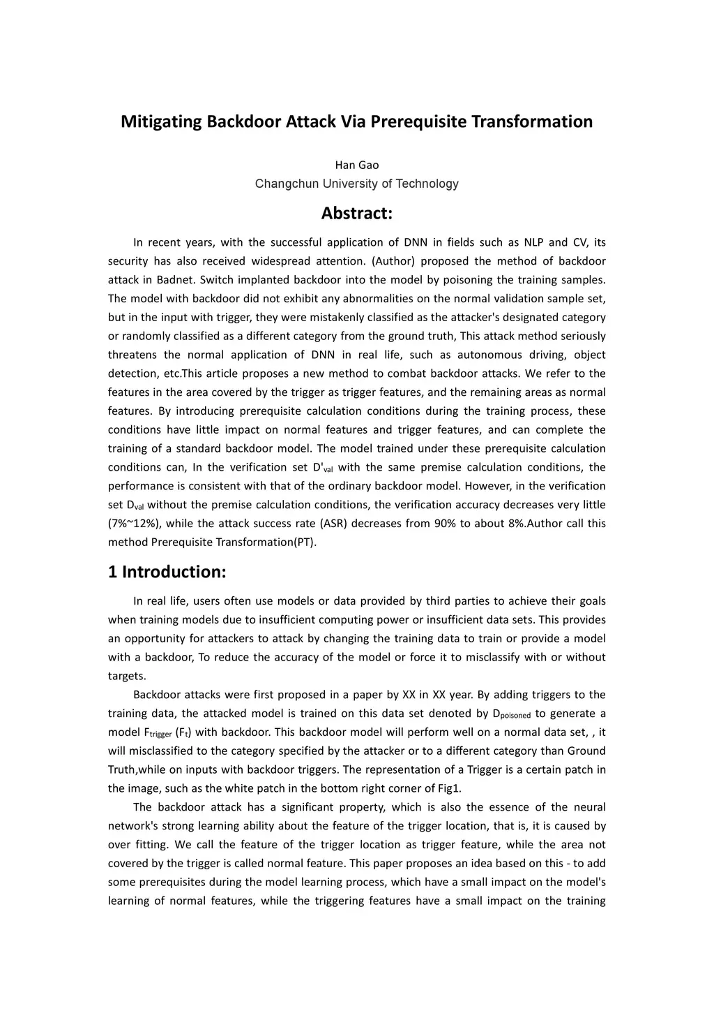 In recent years, with the successful application of DNN in fields such as NLP and CV, its security has also received widespread attention. (Author) proposed the method of backdoor attack in Badnet. Switch implanted backdoor into the model by poisoning the training samples. The model with backdoor did not exhibit any abnormalities on the normal validation sample set, but in the input with trigger, they were mistakenly classified as the attacker's designated category or randomly classified as a different category from the ground truth, This attack method seriously threatens the normal application of DNN in real life, such as autonomous driving, object detection, etc.This article proposes a new method to combat backdoor attacks. We refer to the features in the area covered by the trigger as trigger features, and the remaining areas as normal features. By introducing prerequisite calculation conditions during the training process, these conditions have little impact on normal features and trigger features, and can complete the training of a standard backdoor model. The model trained under these prerequisite calculation conditions can, In the verification set D'val with the same premise calculation conditions, the performance is consistent with that of the ordinary backdoor model. However, in the verification set Dval without the premise calculation conditions, the verification accuracy decreases very little (7%~12%), while the attack success rate (ASR) decreases from 90% to about 8%.Author call this method Prerequisite Transformation(PT).