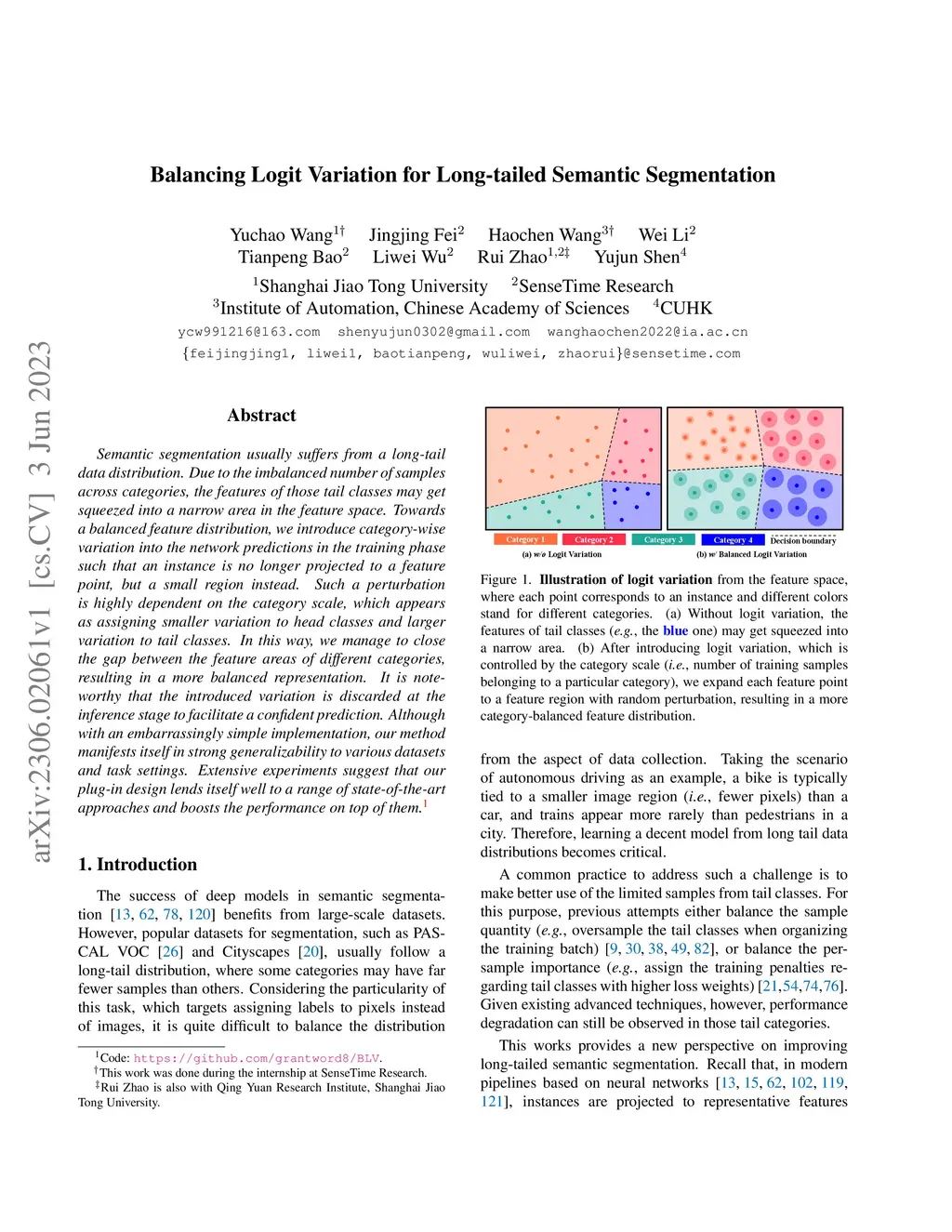 Semantic segmentation usually suffers from a long-tail data distribution. Due to the imbalanced number of samples across categories, the features of those tail classes may get squeezed into a narrow area in the feature space. Towards a balanced feature distribution, we introduce category-wise variation into the network predictions in the training phase such that an instance is no longer projected to a feature point, but a small region instead. Such a perturbation is highly dependent on the category scale, which appears as assigning smaller variation to head classes and larger variation to tail classes. In this way, we manage to close the gap between the feature areas of different categories, resulting in a more balanced representation. It is noteworthy that the introduced variation is discarded at the inference stage to facilitate a confident prediction. Although with an embarrassingly simple implementation, our method manifests itself in strong generalizability to various datasets and task settings. Extensive experiments suggest that our plug-in design lends itself well to a range of state-of-the-art approaches and boosts the performance on top of them.
