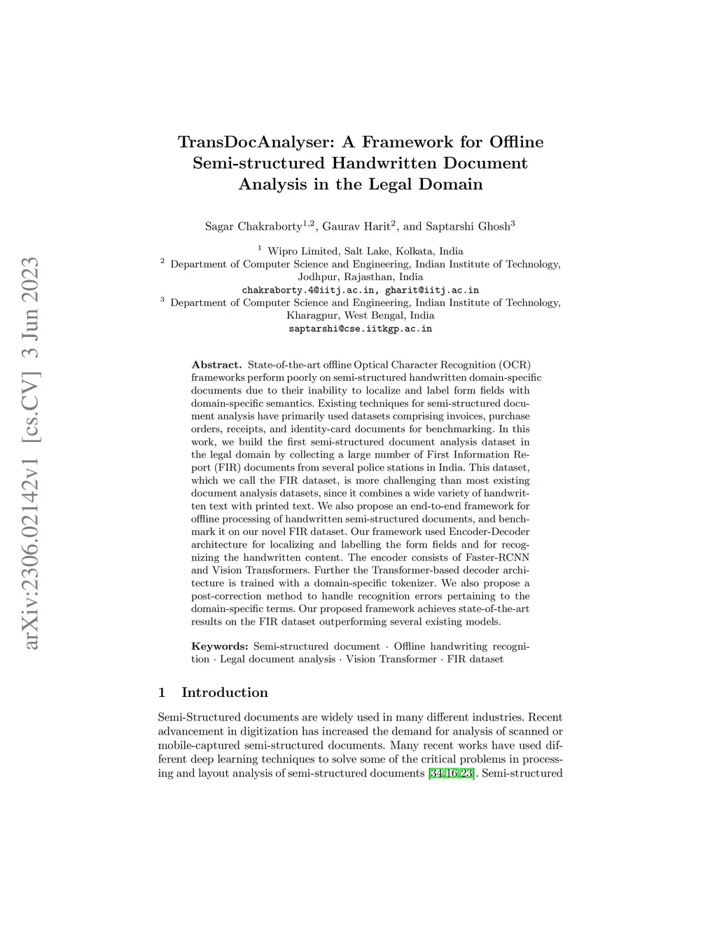 State-of-the-art offline Optical Character Recognition (OCR) frameworks perform poorly on semi-structured handwritten domain-specific documents due to their inability to localize and label form fields with domain-specific semantics. Existing techniques for semi-structured document analysis have primarily used datasets comprising invoices, purchase orders, receipts, and identity-card documents for benchmarking. In this work, we build the first semi-structured document analysis dataset in the legal domain by collecting a large number of First Information Report (FIR) documents from several police stations in India. This dataset, which we call the FIR dataset, is more challenging than most existing document analysis datasets, since it combines a wide variety of handwritten text with printed text. We also propose an end-to-end framework for offline processing of handwritten semi-structured documents, and benchmark it on our novel FIR dataset. Our framework used Encoder-Decoder architecture for localizing and labelling the form fields and for recognizing the handwritten content. The encoder consists of Faster-RCNN and Vision Transformers. Further the Transformer-based decoder architecture is trained with a domain-specific tokenizer. We also propose a post-correction method to handle recognition errors pertaining to the domain-specific terms. Our proposed framework achieves state-of-the-art results on the FIR dataset outperforming several existing models