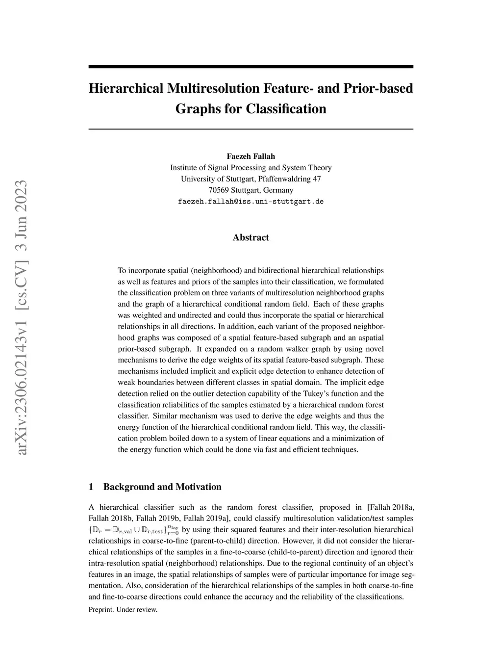 To incorporate spatial (neighborhood) and bidirectional hierarchical relationships as well as features and priors of the samples into their classification, we formulated the classification problem on three variants of multiresolution neighborhood graphs and the graph of a hierarchical conditional random field. Each of these graphs was weighted and undirected and could thus incorporate the spatial or hierarchical relationships in all directions. In addition, each variant of the proposed neighborhood graphs was composed of a spatial feature-based subgraph and an aspatial prior-based subgraph. It expanded on a random walker graph by using novel mechanisms to derive the edge weights of its spatial feature-based subgraph. These mechanisms included implicit and explicit edge detection to enhance detection of weak boundaries between different classes in spatial domain. The implicit edge detection relied on the outlier detection capability of the Tukey's function and the classification reliabilities of the samples estimated by a hierarchical random forest classifier. Similar mechanism was used to derive the edge weights and thus the energy function of the hierarchical conditional random field. This way, the classification problem boiled down to a system of linear equations and a minimization of the energy function which could be done via fast and efficient techniques.