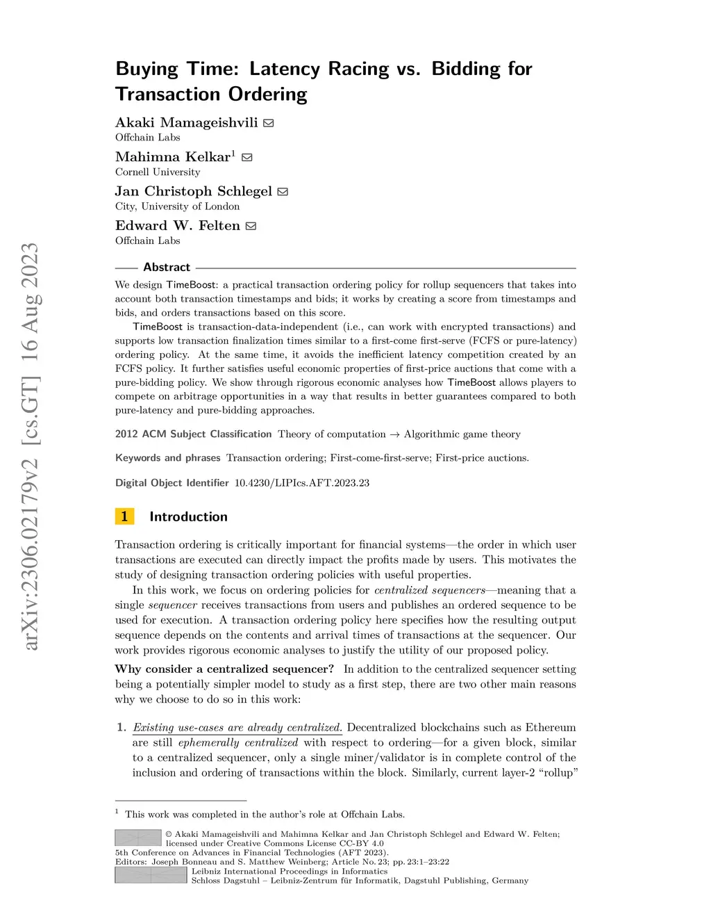 We design a practical algorithm for transaction ordering that takes into account both transaction timestamps and bids. The algorithm guarantees that users get their transactions published with bounded delay against a bid, while it extracts a fair value from sophisticated users that have an edge in latency, by moving expenditure from investment in latency improvement technology to bidding. The algorithm creates a score from timestamps and bids, and orders transactions based on the score. We first show that a scoring rule is the only type of rule that satisfies the independence of latency races. We provide an economic analysis of the protocol in an environment of private information, where investment in latency is made ex-ante or interim stages, while bidding happens at the interim stage where private signals have been observed. The algorithm is useful for transaction sequencing in rollups or in other environments where the sequencer has privileged access to order flows.