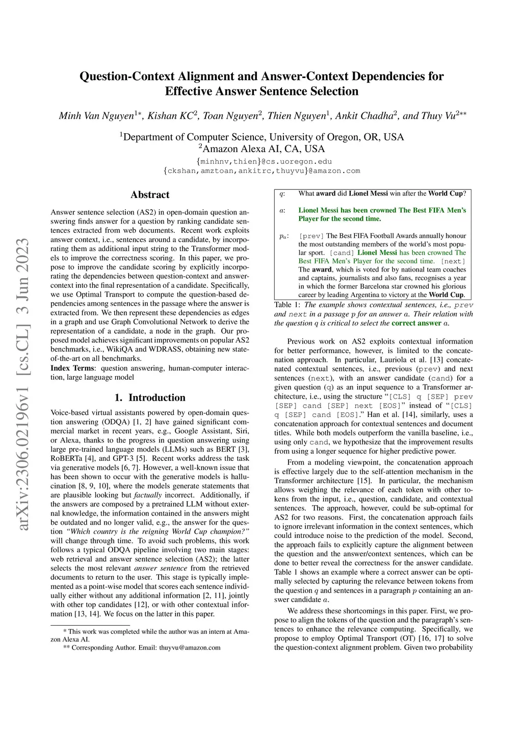 Answer sentence selection (AS2) in open-domain question answering finds answer for a question by ranking candidate sentences extracted from web documents. Recent work exploits answer context, i.e., sentences around a candidate, by incorporating them as additional input string to the Transformer models to improve the correctness scoring. In this paper, we propose to improve the candidate scoring by explicitly incorporating the dependencies between question-context and answer-context into the final representation of a candidate. Specifically, we use Optimal Transport to compute the question-based dependencies among sentences in the passage where the answer is extracted from. We then represent these dependencies as edges in a graph and use Graph Convolutional Network to derive the representation of a candidate, a node in the graph. Our proposed model achieves significant improvements on popular AS2 benchmarks, i.e., WikiQA and WDRASS, obtaining new state-of-the-art on all benchmarks.