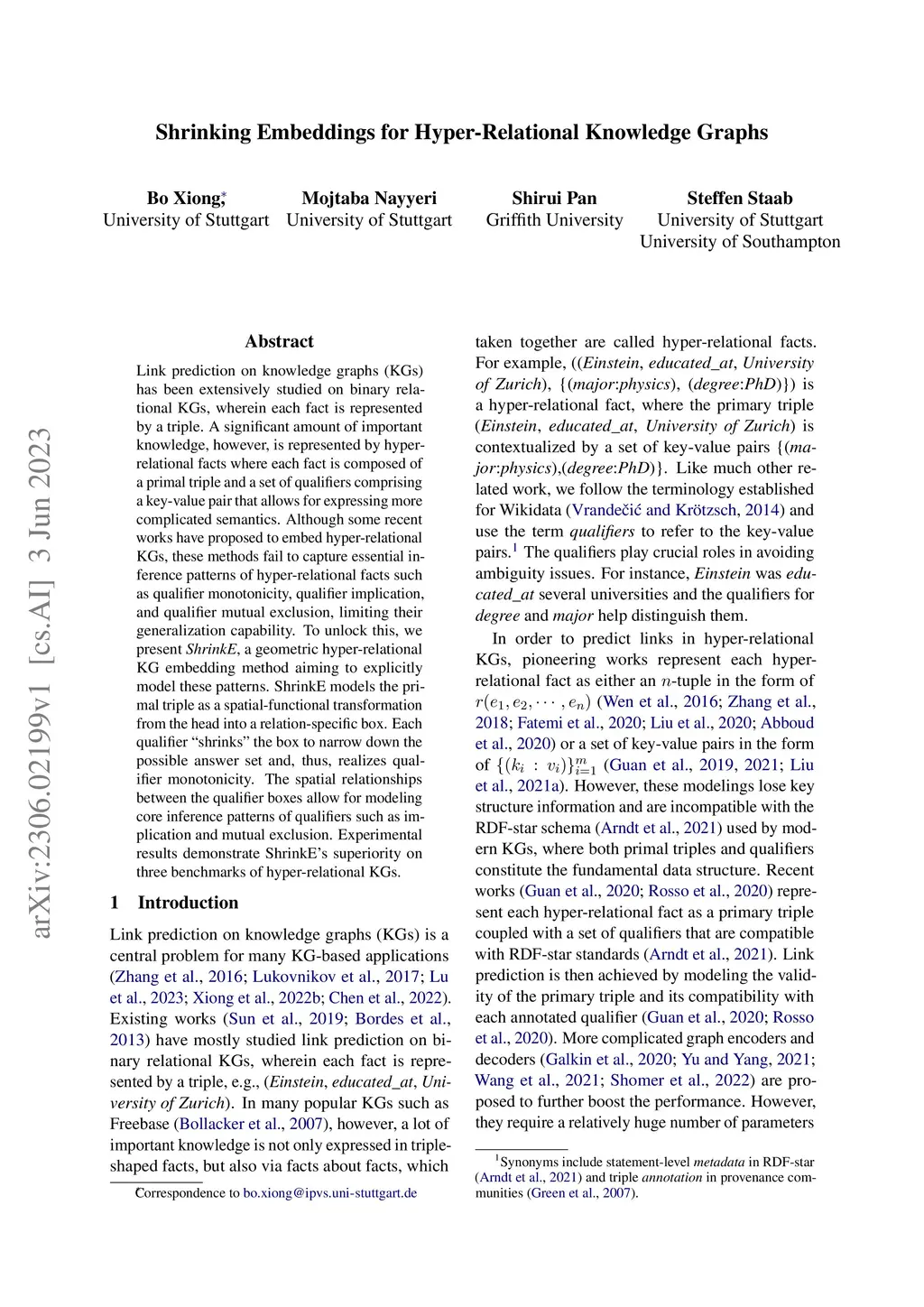 Link prediction on knowledge graphs (KGs) has been extensively studied on binary relational KGs, wherein each fact is represented by a triple. A significant amount of important knowledge, however, is represented by hyper-relational facts where each fact is composed of a primal triple and a set of qualifiers comprising a key-value pair that allows for expressing more complicated semantics. Although some recent works have proposed to embed hyper-relational KGs, these methods fail to capture essential inference patterns of hyper-relational facts such as qualifier monotonicity, qualifier implication, and qualifier mutual exclusion, limiting their generalization capability. To unlock this, we present \emph{ShrinkE}, a geometric hyper-relational KG embedding method aiming to explicitly model these patterns. ShrinkE models the primal triple as a spatial-functional transformation from the head into a relation-specific box. Each qualifier ``shrinks'' the box to narrow down the possible answer set and, thus, realizes qualifier monotonicity. The spatial relationships between the qualifier boxes allow for modeling core inference patterns of qualifiers such as implication and mutual exclusion. Experimental results demonstrate ShrinkE's superiority on three benchmarks of hyper-relational KGs.